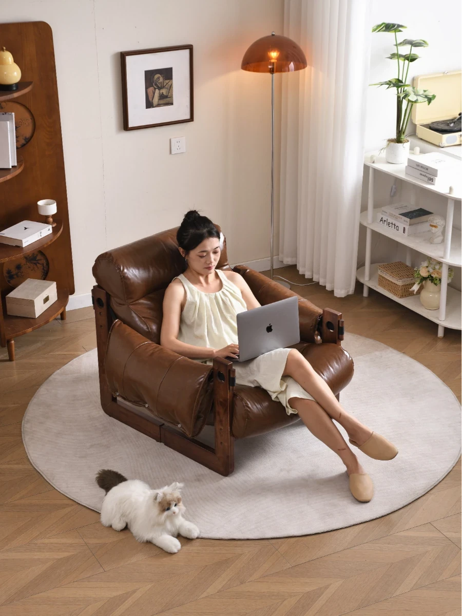 北欧スタイルの侘び寂び風リラックスチェア - 高品質な無垢材使用の一人掛けソファ。レトロなデザインが魅力の居心地の良いリビング空間を演出します。あなたのライフスタイルにぴったりの一品です!