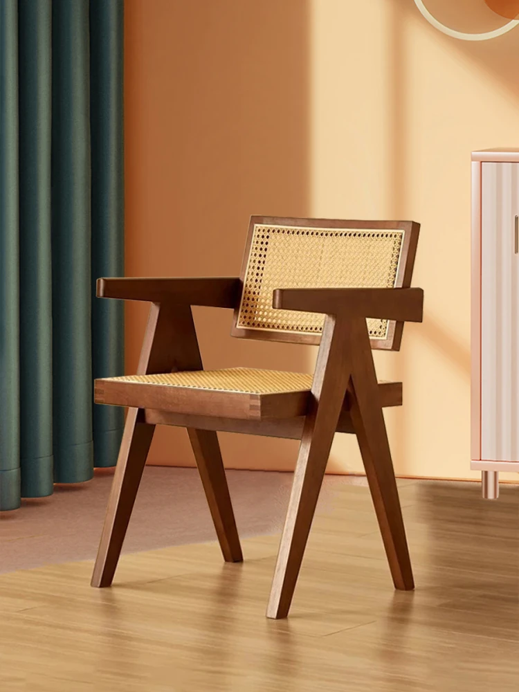 海勝林のヴィンテージ侘寂スタイルの実木と藤編みのダイニングチェア、デザイナーが手掛けた家用アームチェア。民宿や自宅にぴったりな昌ディガールチェアで、心地よい時間をお楽しみください。