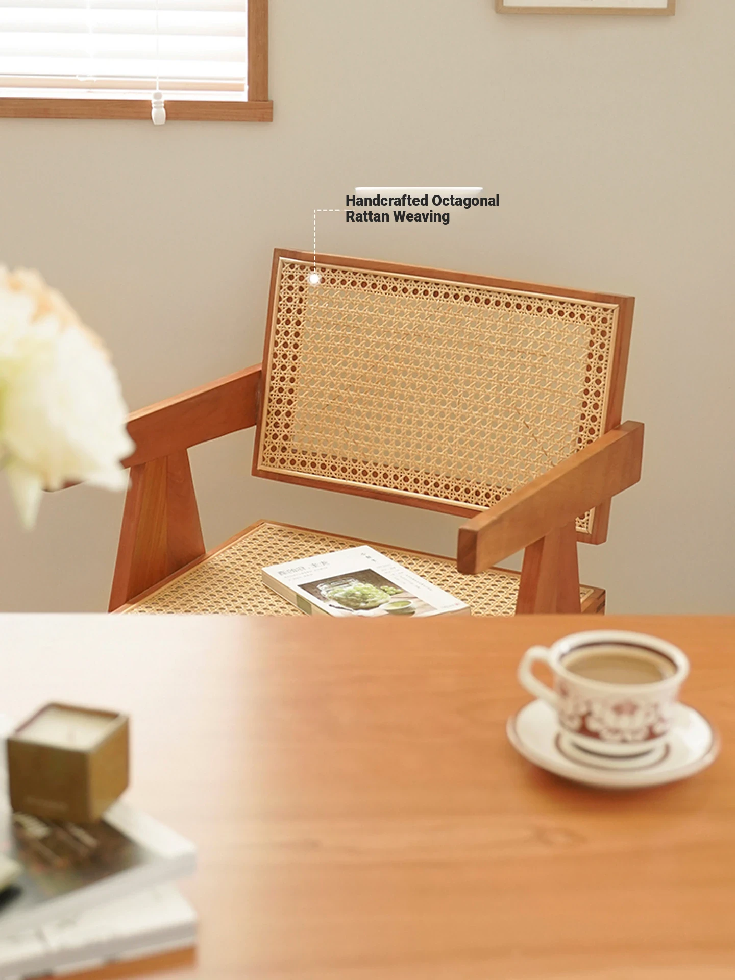 Solid Wood Dining Chair - Chandigarh Style Wabi-Sabi Vintage Rattan Armchair for Living Room, Dining Room, and Study - Comfortable and Elegant Backrest Chair