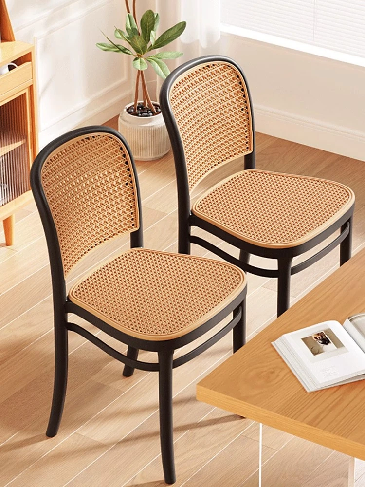 Vintage Rattan Dining Chair - Wabi-Sabi Style, Solid Wood Frame, Elegant Black Finish, Perfect for Home Use and Chic Dining Spaces.