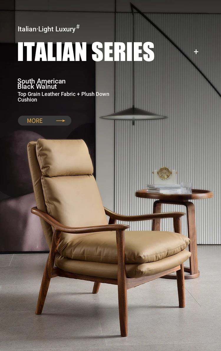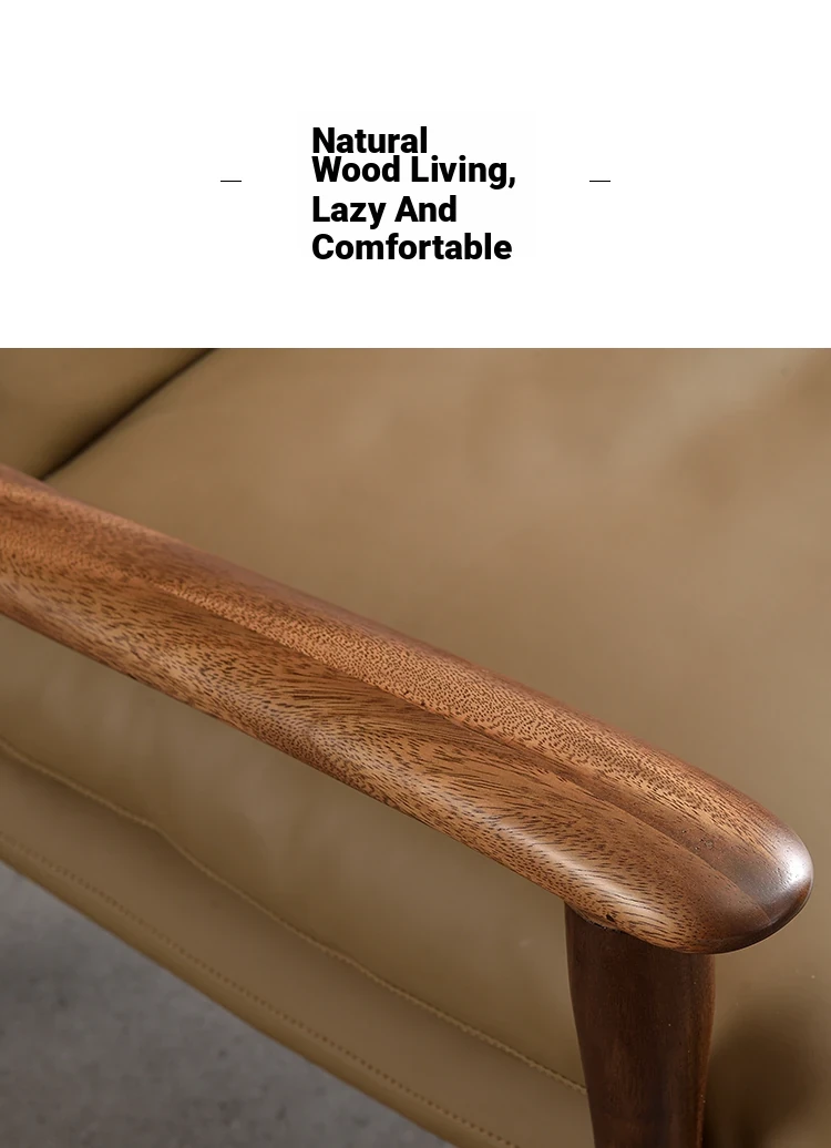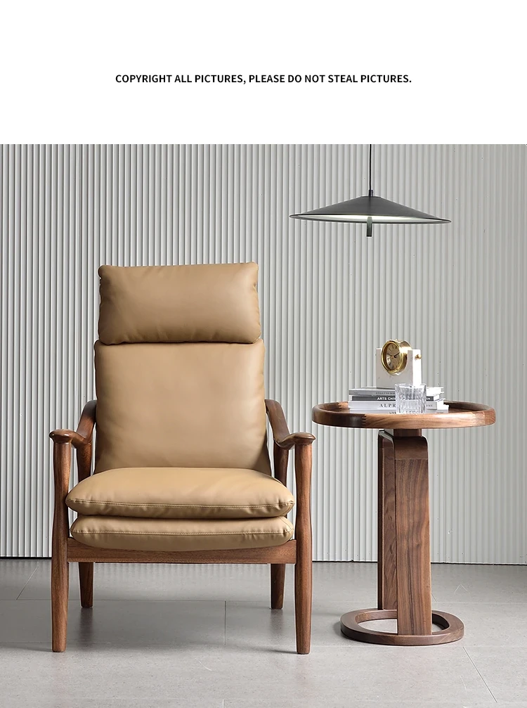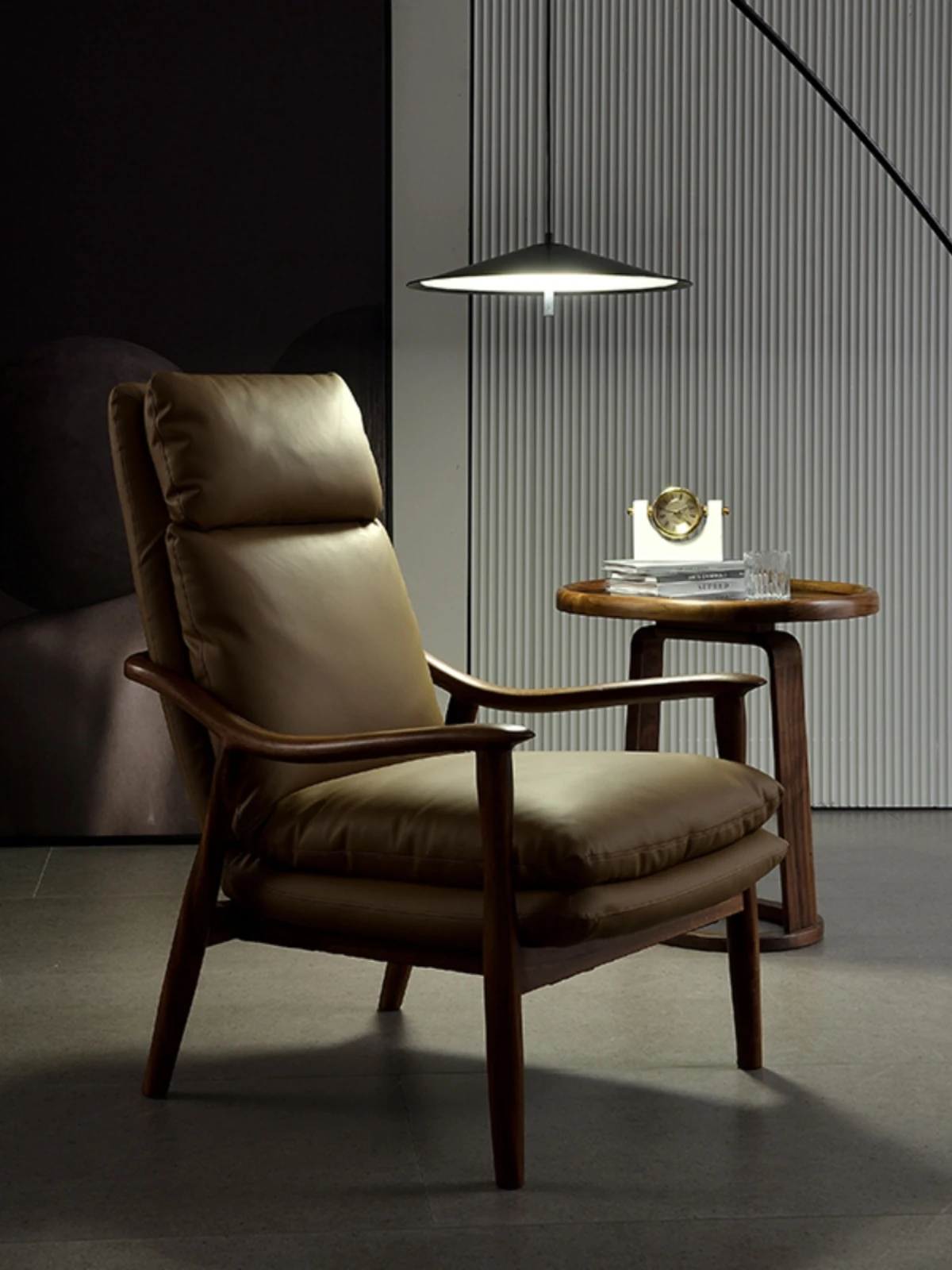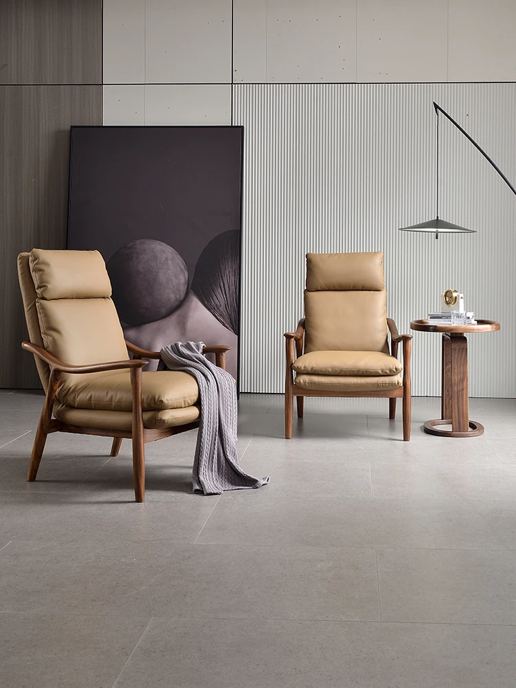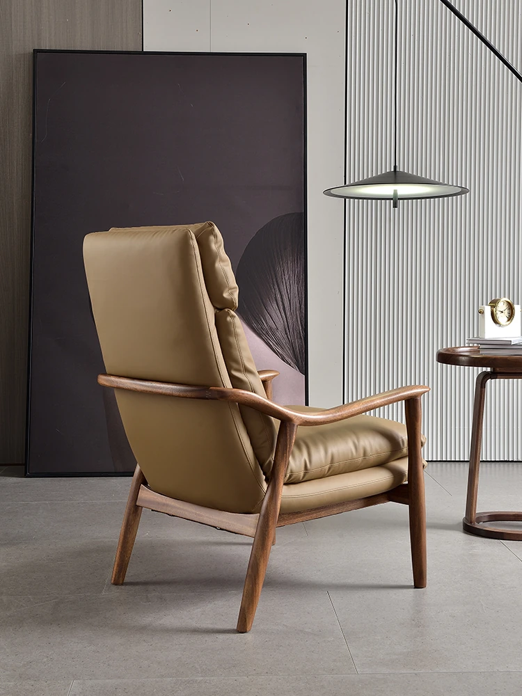 Modern Minimalist Black Walnut Solid Wood Leisure Chair - Comfortable Leather Sofa Chair for Living Room, Perfect for Relaxing on the Balcony or as a Single Recliner.