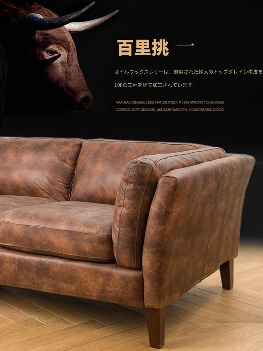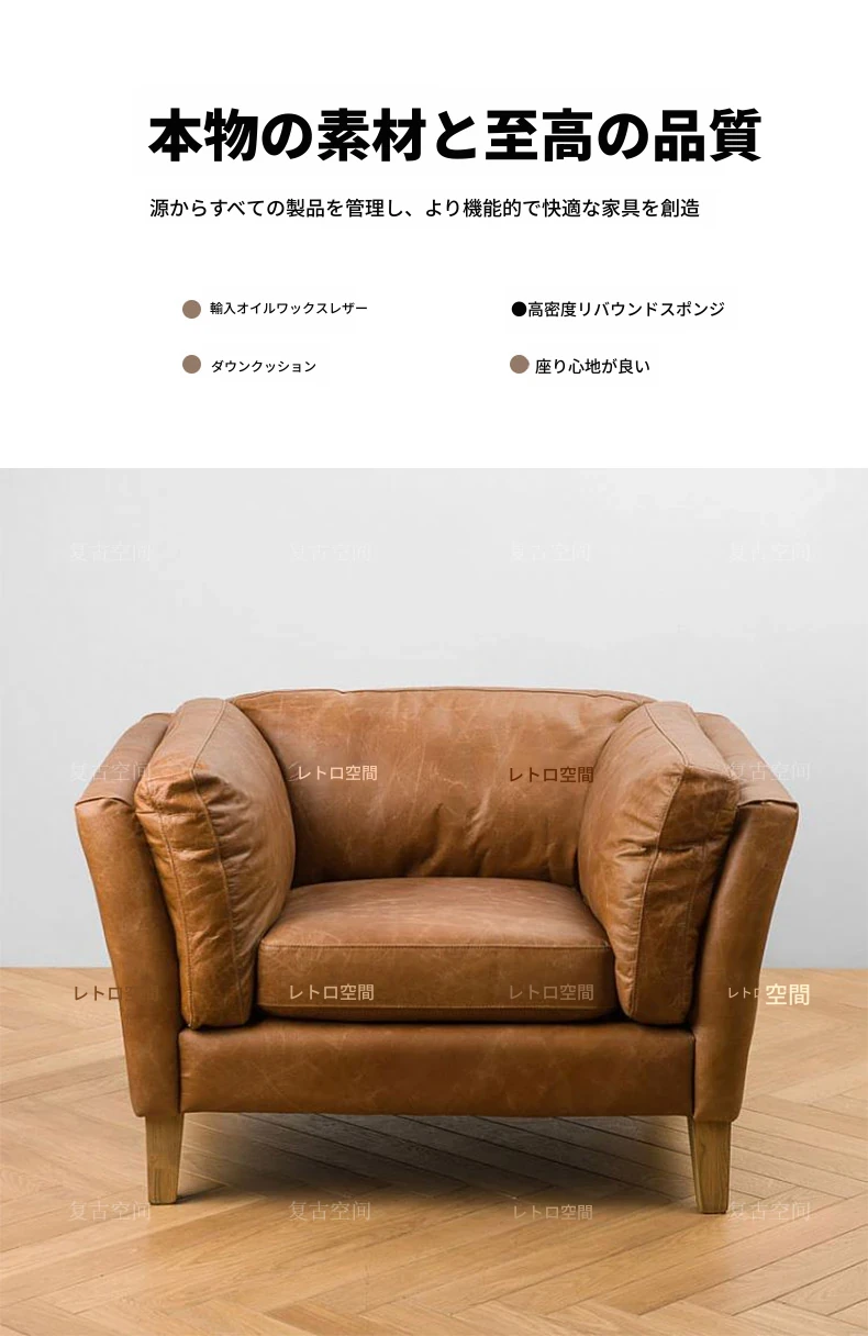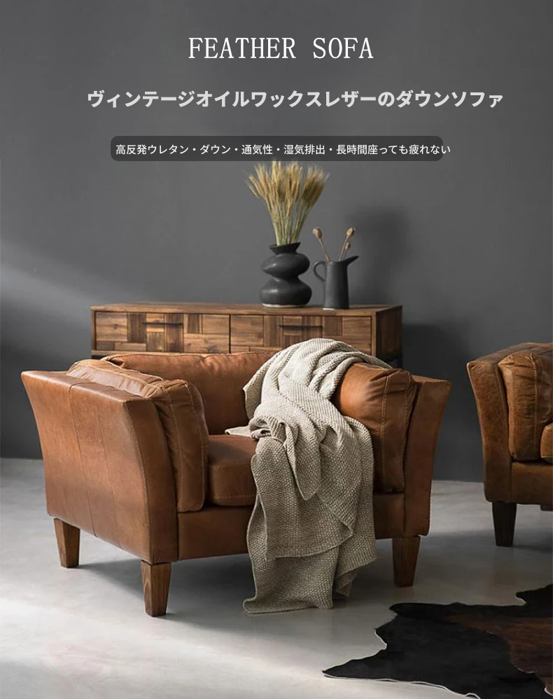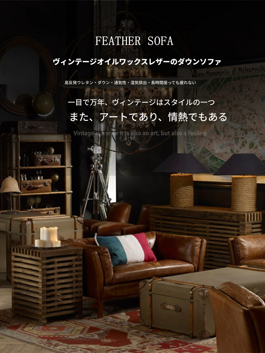 アメリカンスタイルの本革ソファー、インダストリアルビンテージ風のオイルワックス仕上げ、牛皮の風合いを活かしたアンティークデザイン。別荘やクラブ、バーにぴったりの一人用ダウンソファー!快適さとスタイルを両立させた極上のひとときを。