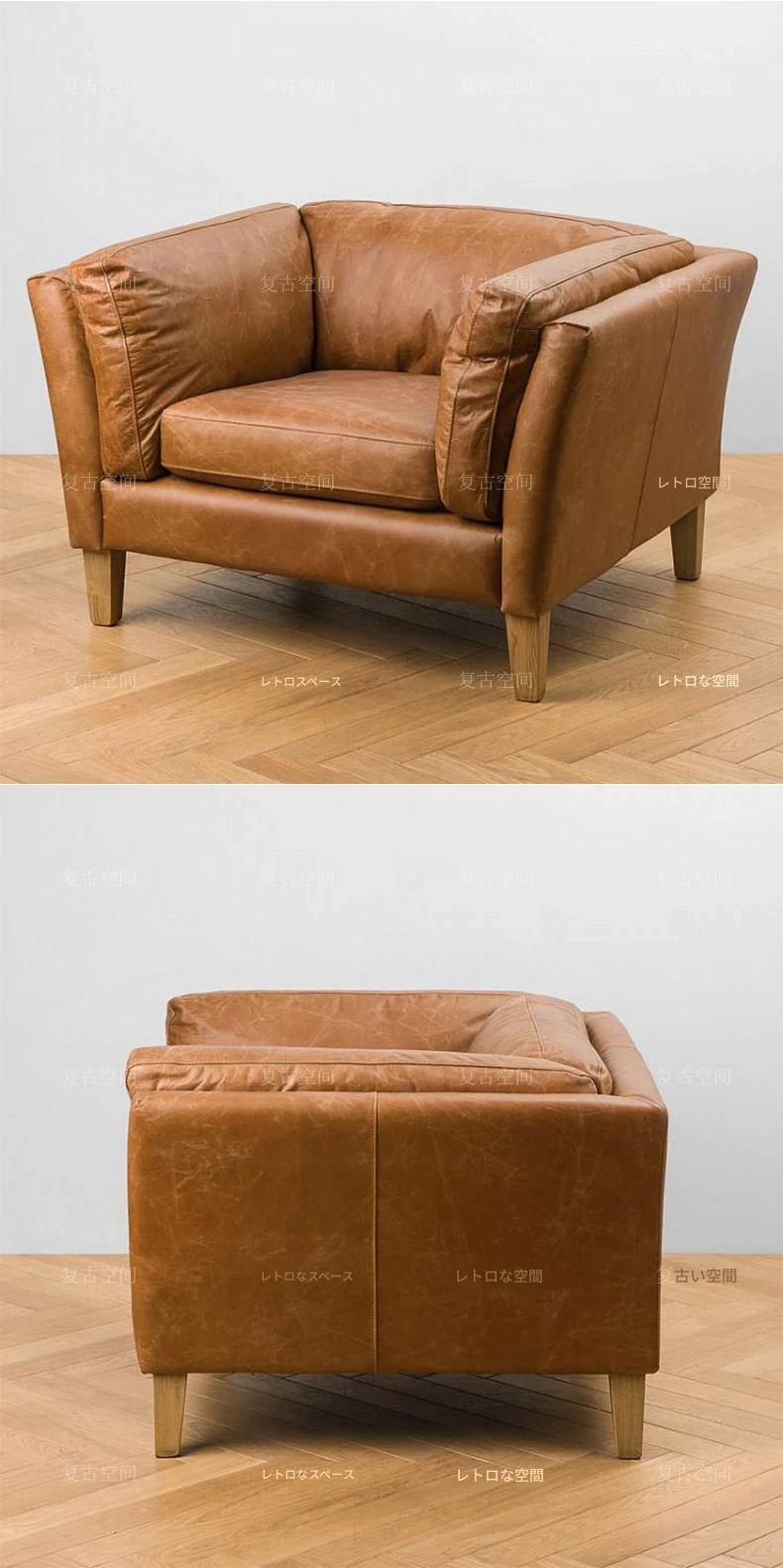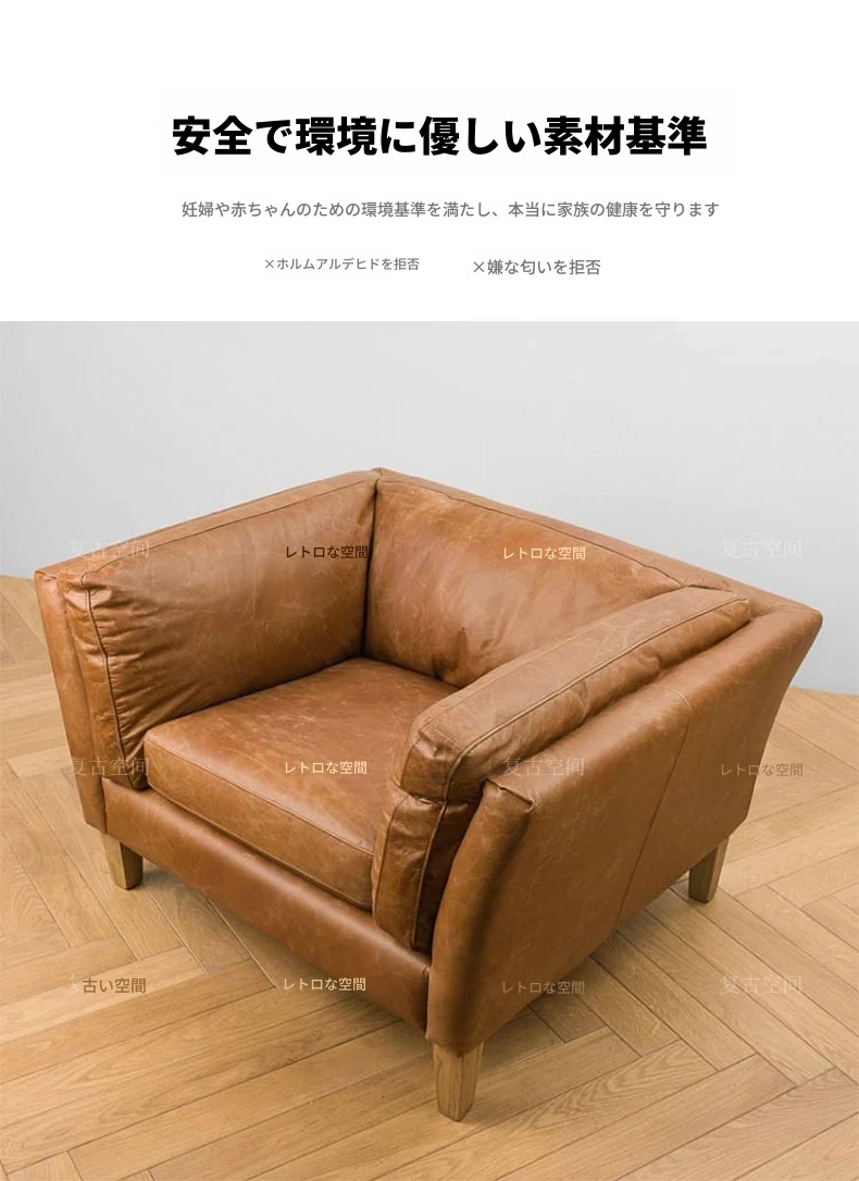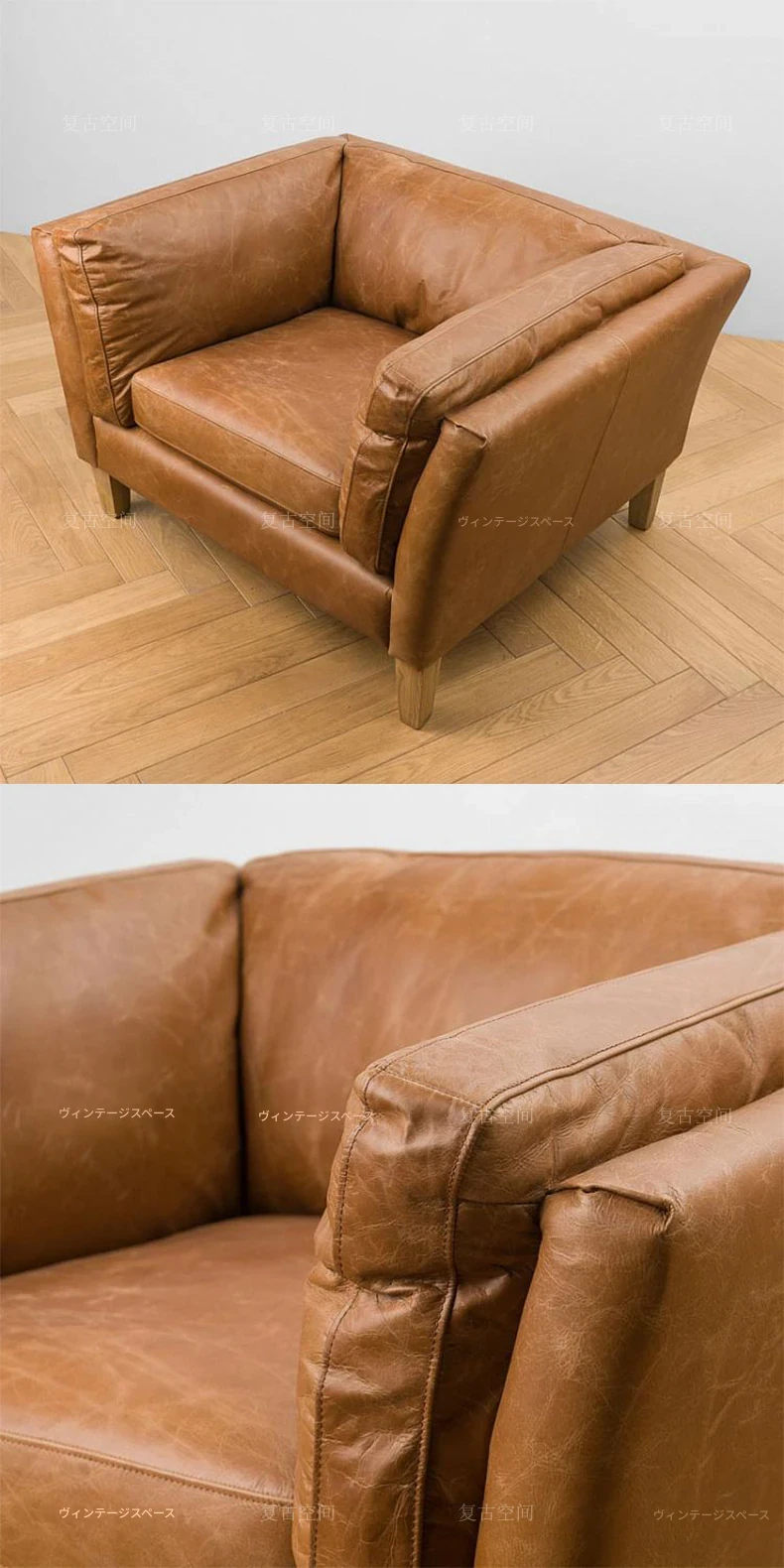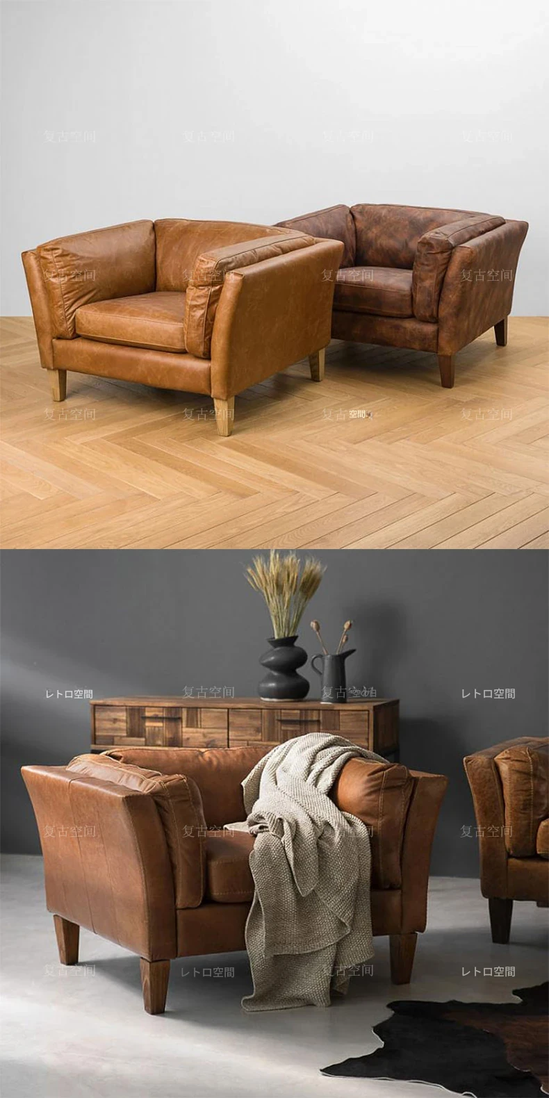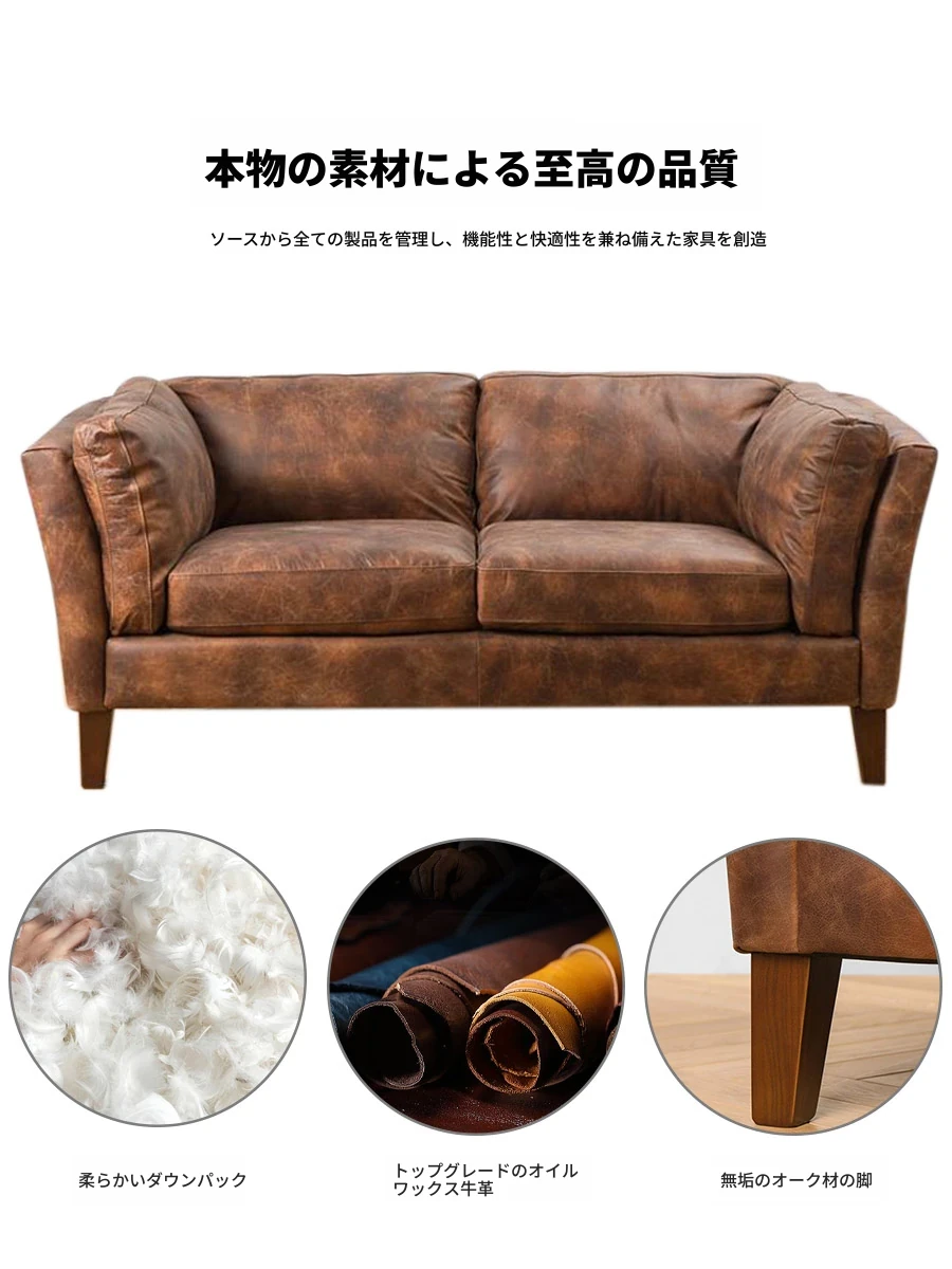 アメリカンスタイルの本革ソファー、インダストリアルビンテージ風のオイルワックス仕上げ、牛皮の風合いを活かしたアンティークデザイン。別荘やクラブ、バーにぴったりの一人用ダウンソファー!快適さとスタイルを両立させた極上のひとときを。