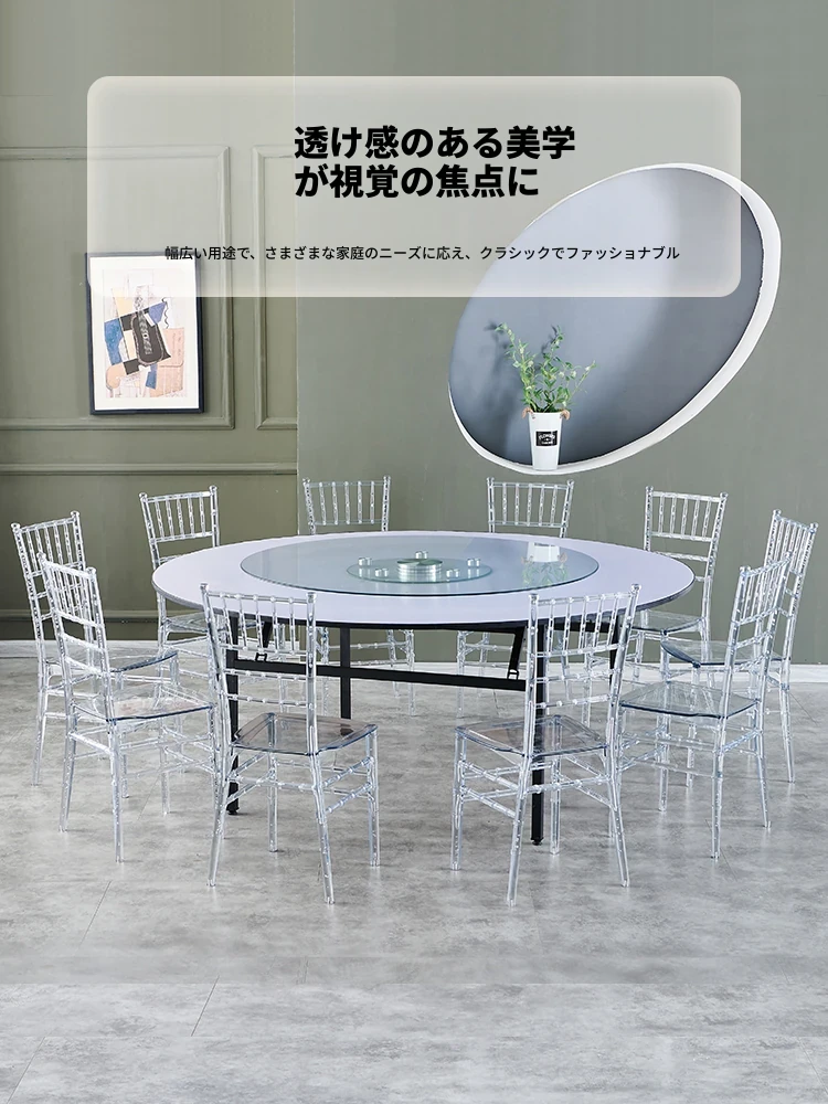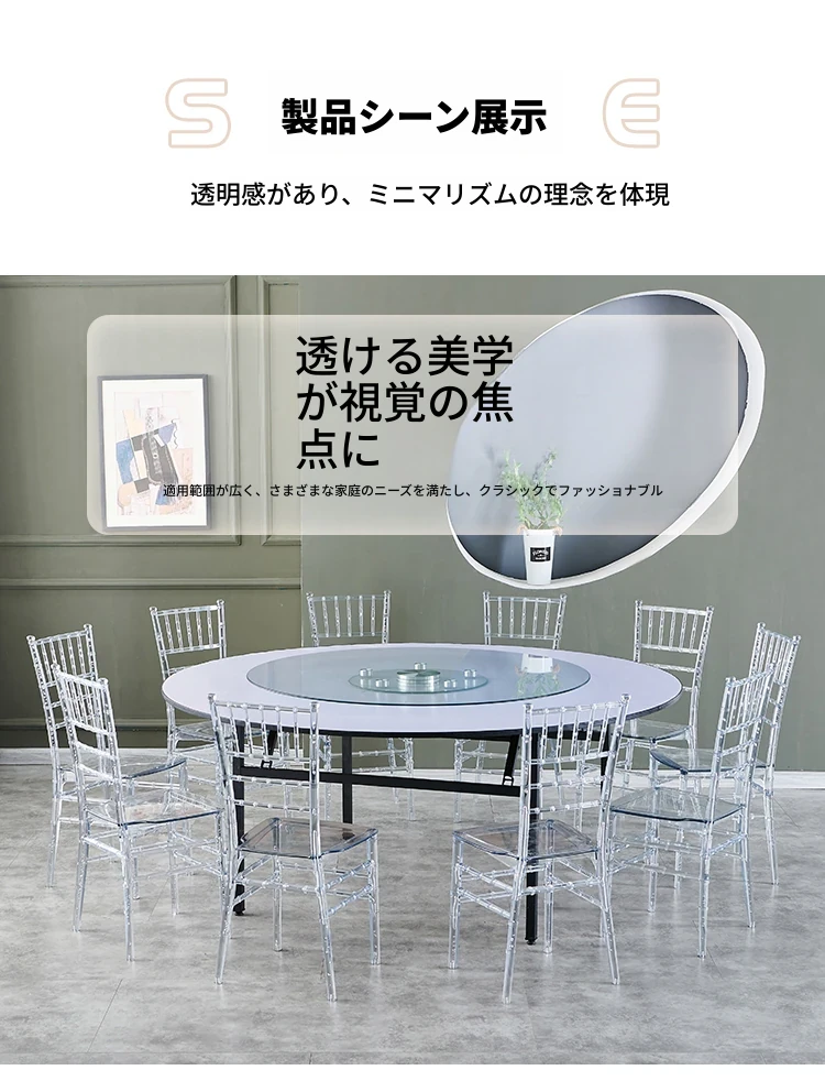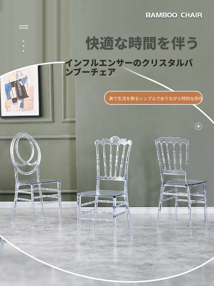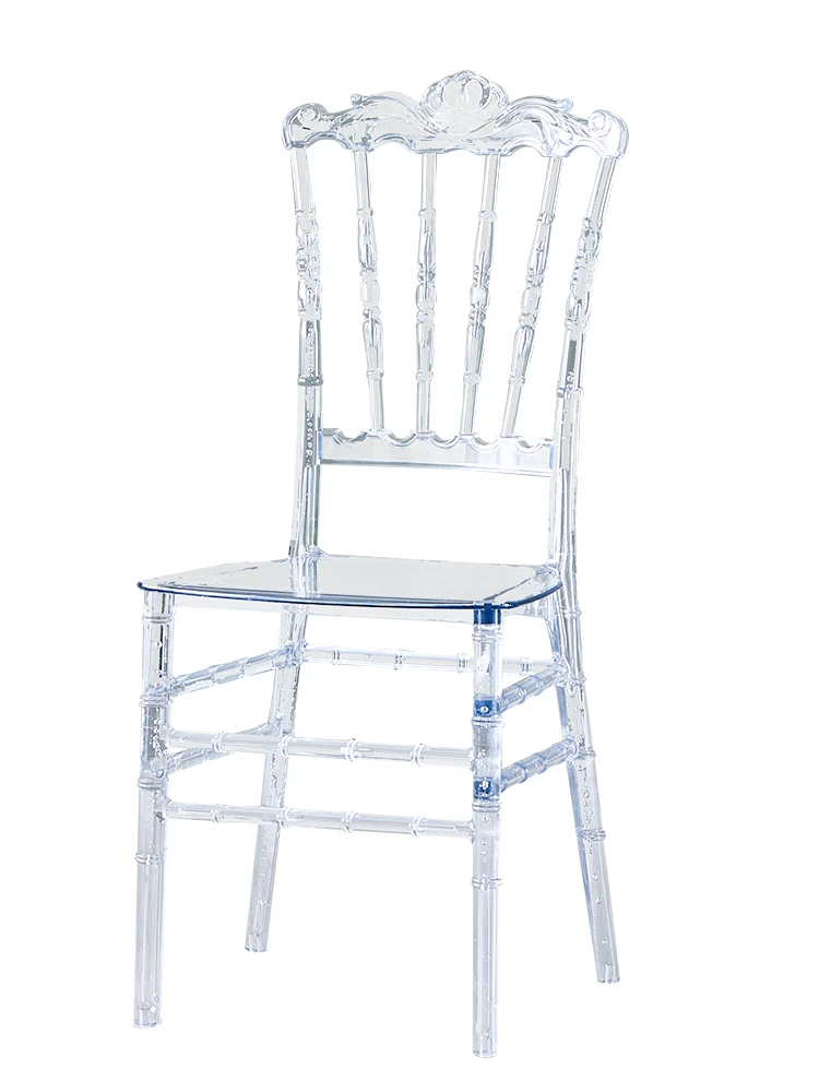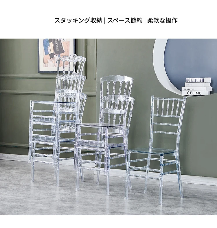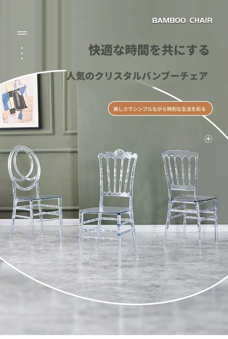 透明でエレガントなクリスタルチェア - 婚礼やイベントに最適!耐久性のあるプラスチック製で、屋外でも使用可能なナポレオンスタイルの竹節デザイン。華やかな雰囲気を演出し、ゲストを魅了する完璧な選択です!