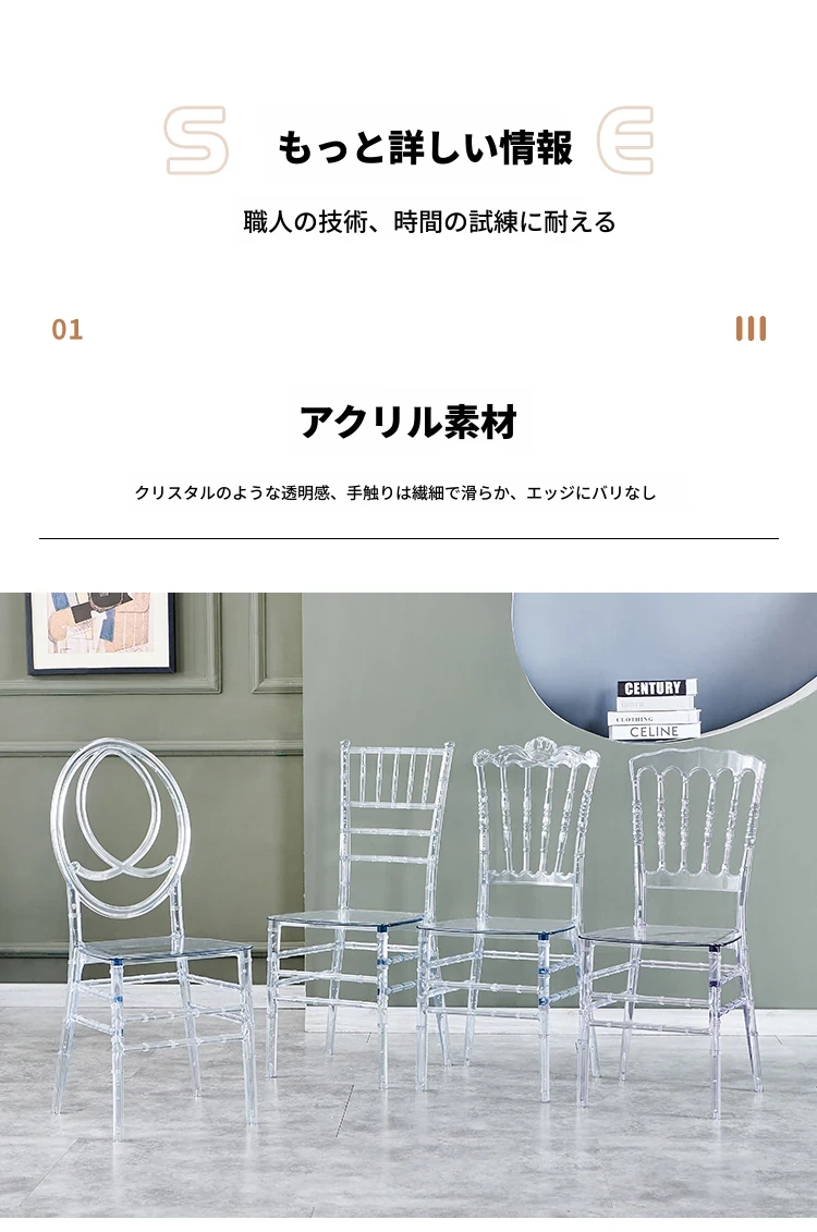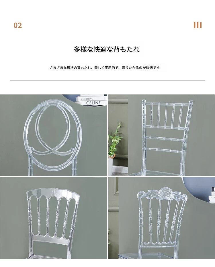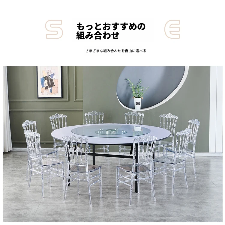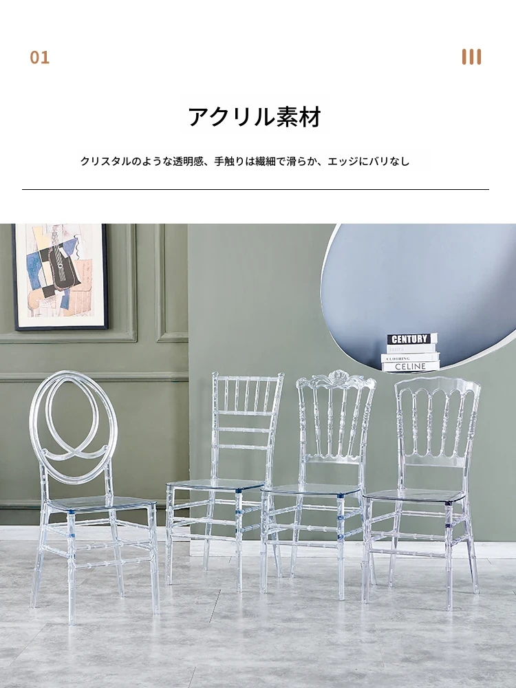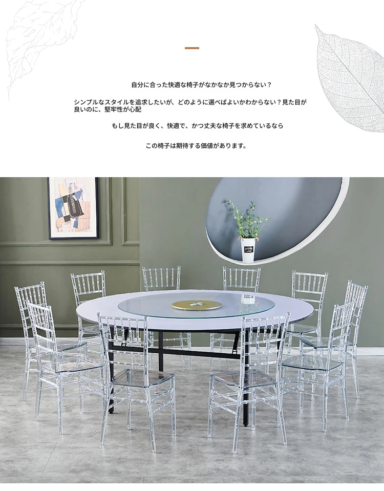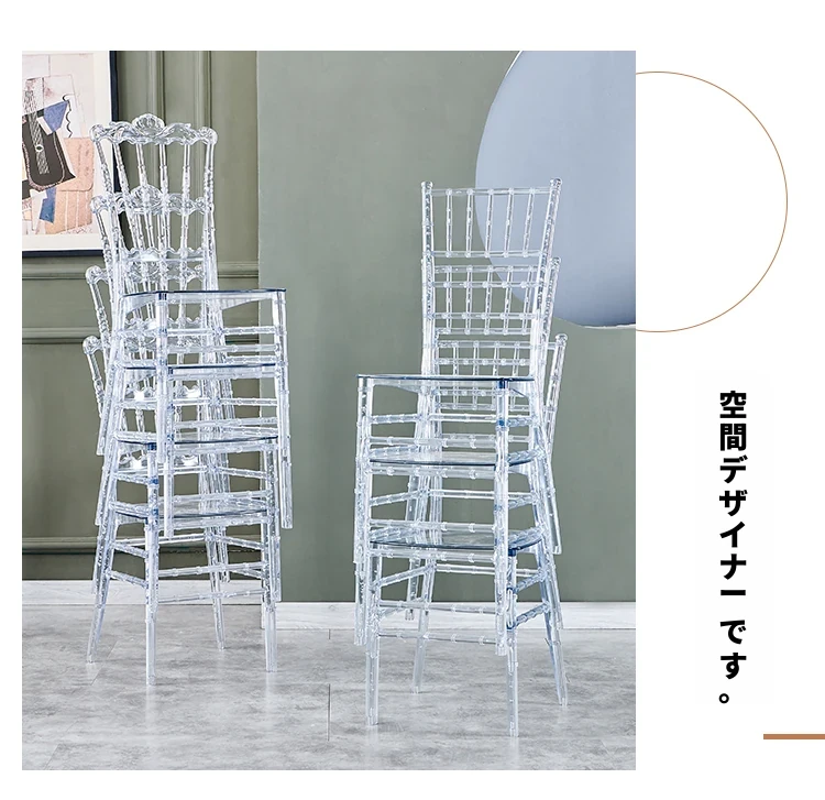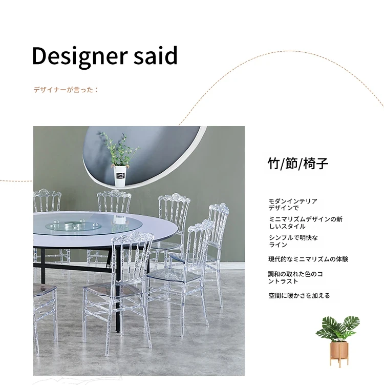透明でエレガントなクリスタルチェア - 婚礼やイベントに最適!耐久性のあるプラスチック製で、屋外でも使用可能なナポレオンスタイルの竹節デザイン。華やかな雰囲気を演出し、ゲストを魅了する完璧な選択です!
