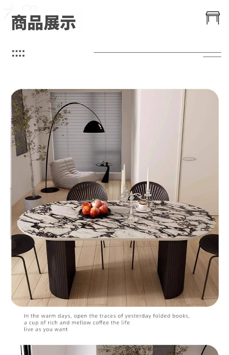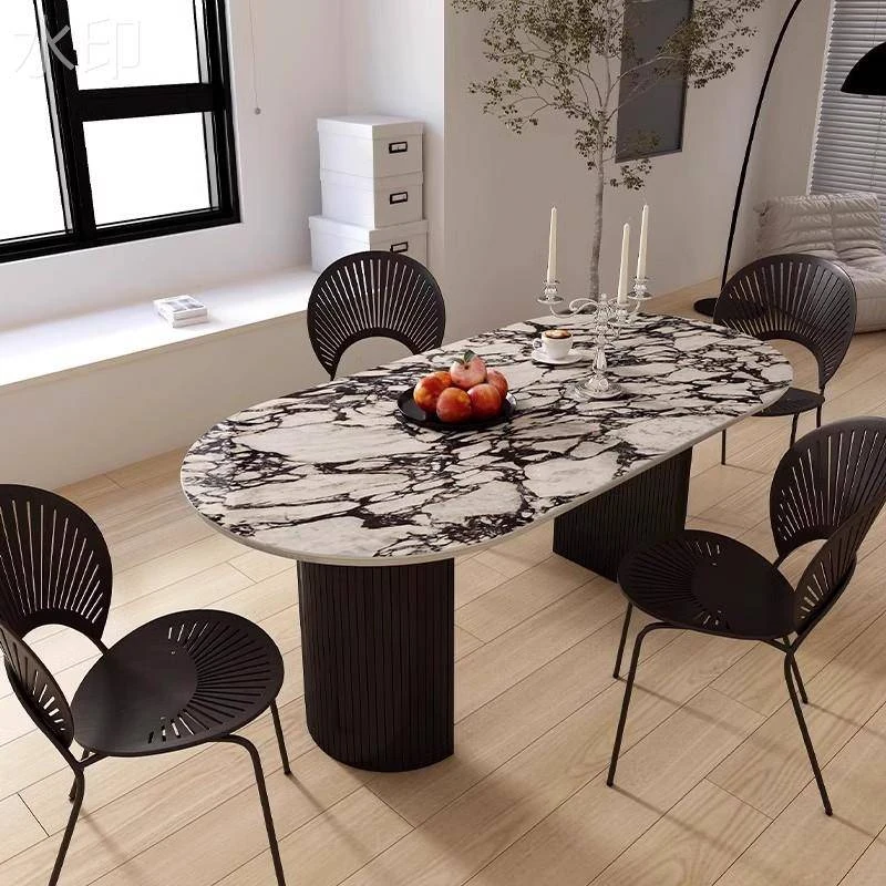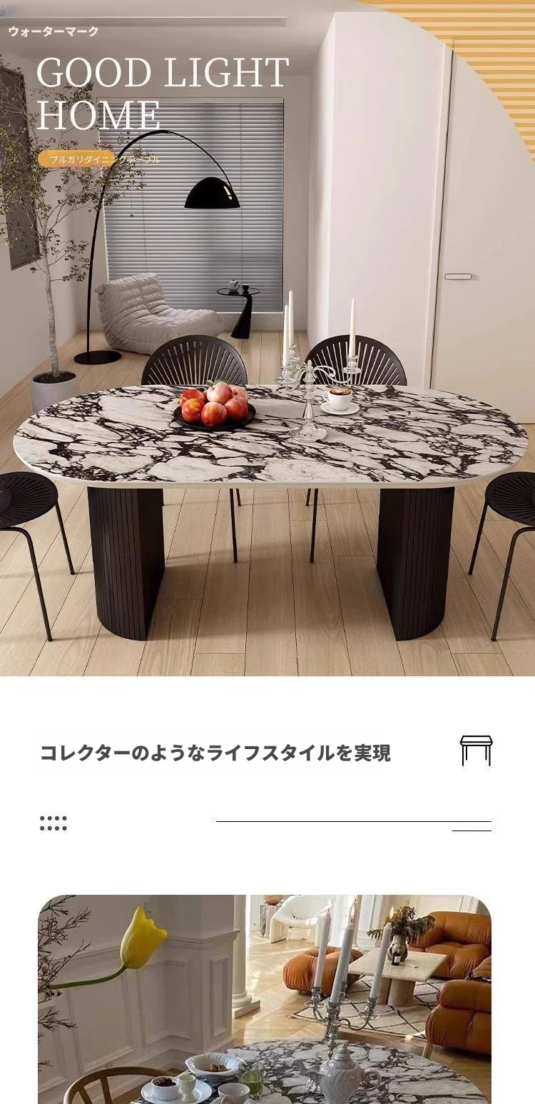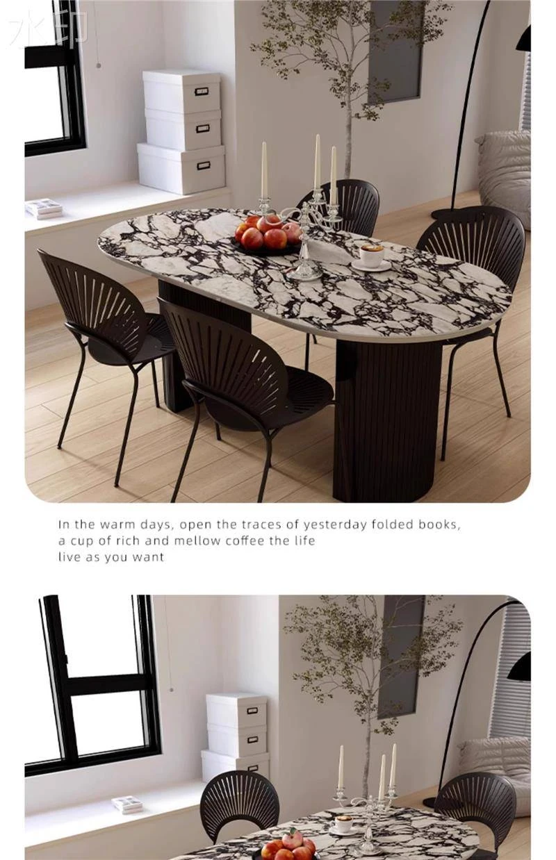 フレンチクリーム風マーブルダイニングテーブル|現代的なラグジュアリー感を演出するシンプルなデザイン|大小様々な部屋にぴったりのオーバル型テーブルとチェアのセット