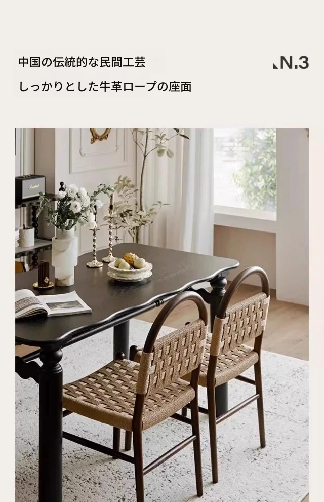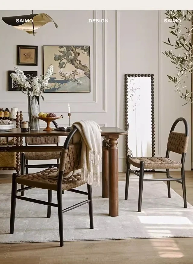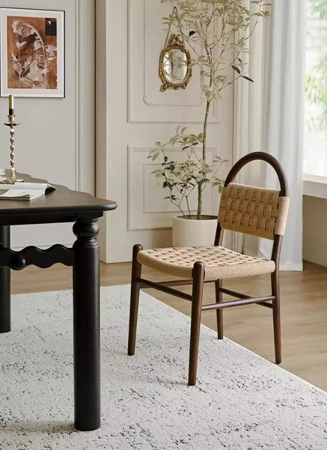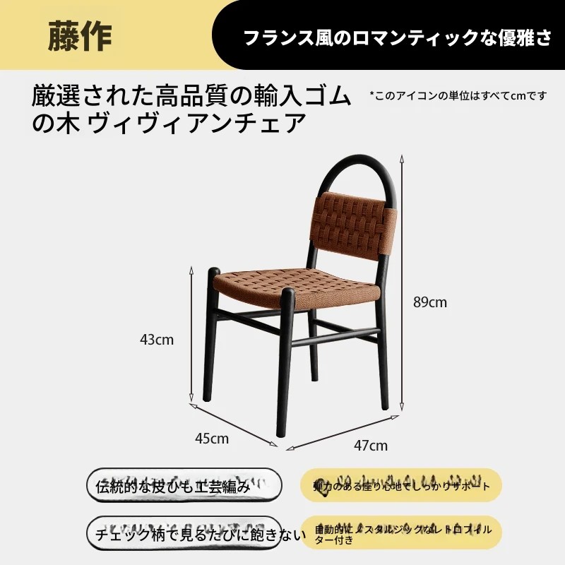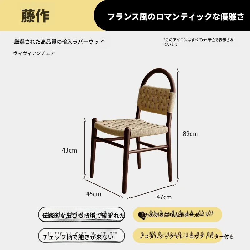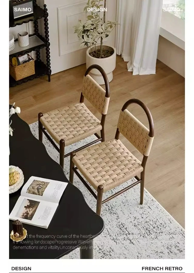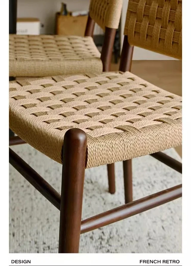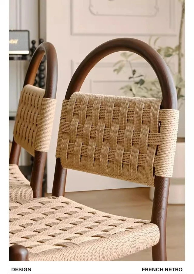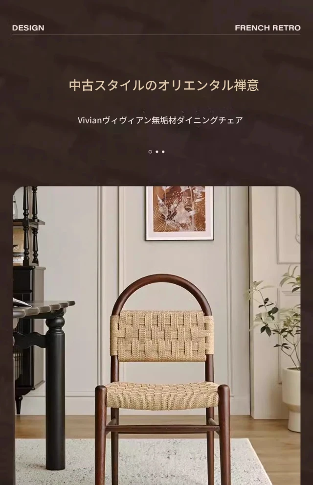 フランス風レトロ無垢材リビングダイニングチェア|アメリカンオークのヴィンテージスタイル|侘寂の美学を取り入れた書斎用ウィービングチェア|おしゃれで心地よい空間を演出!