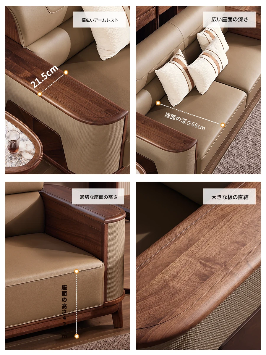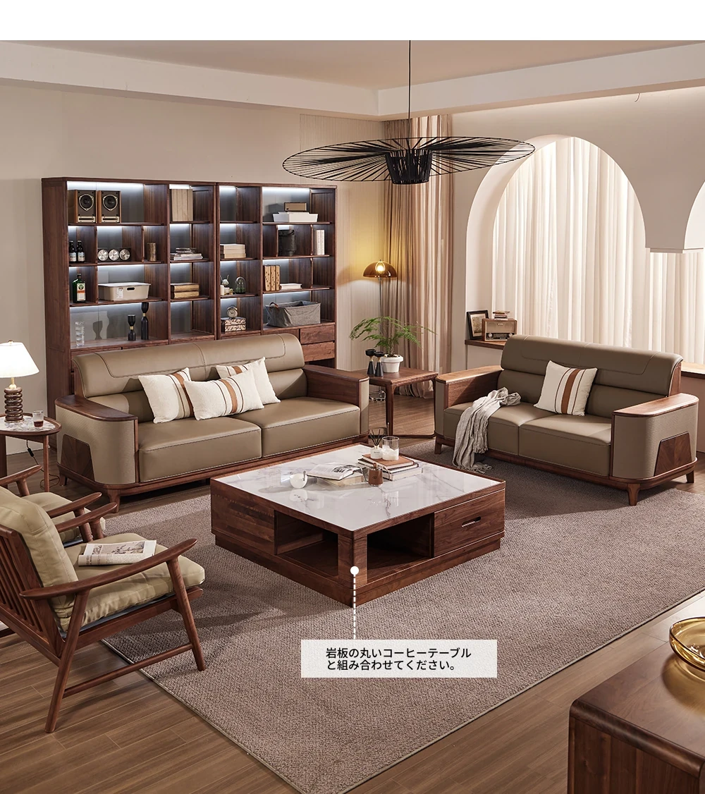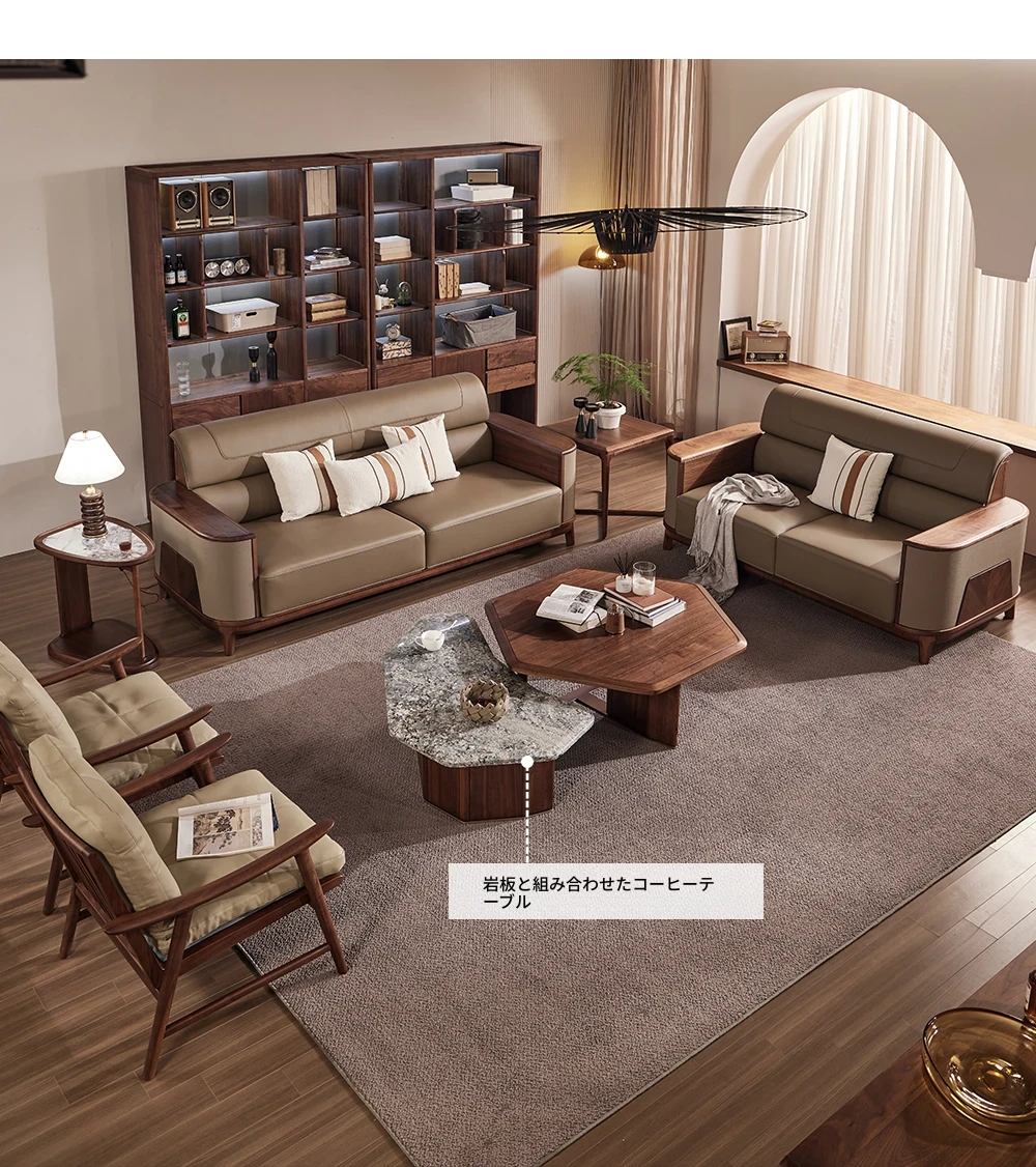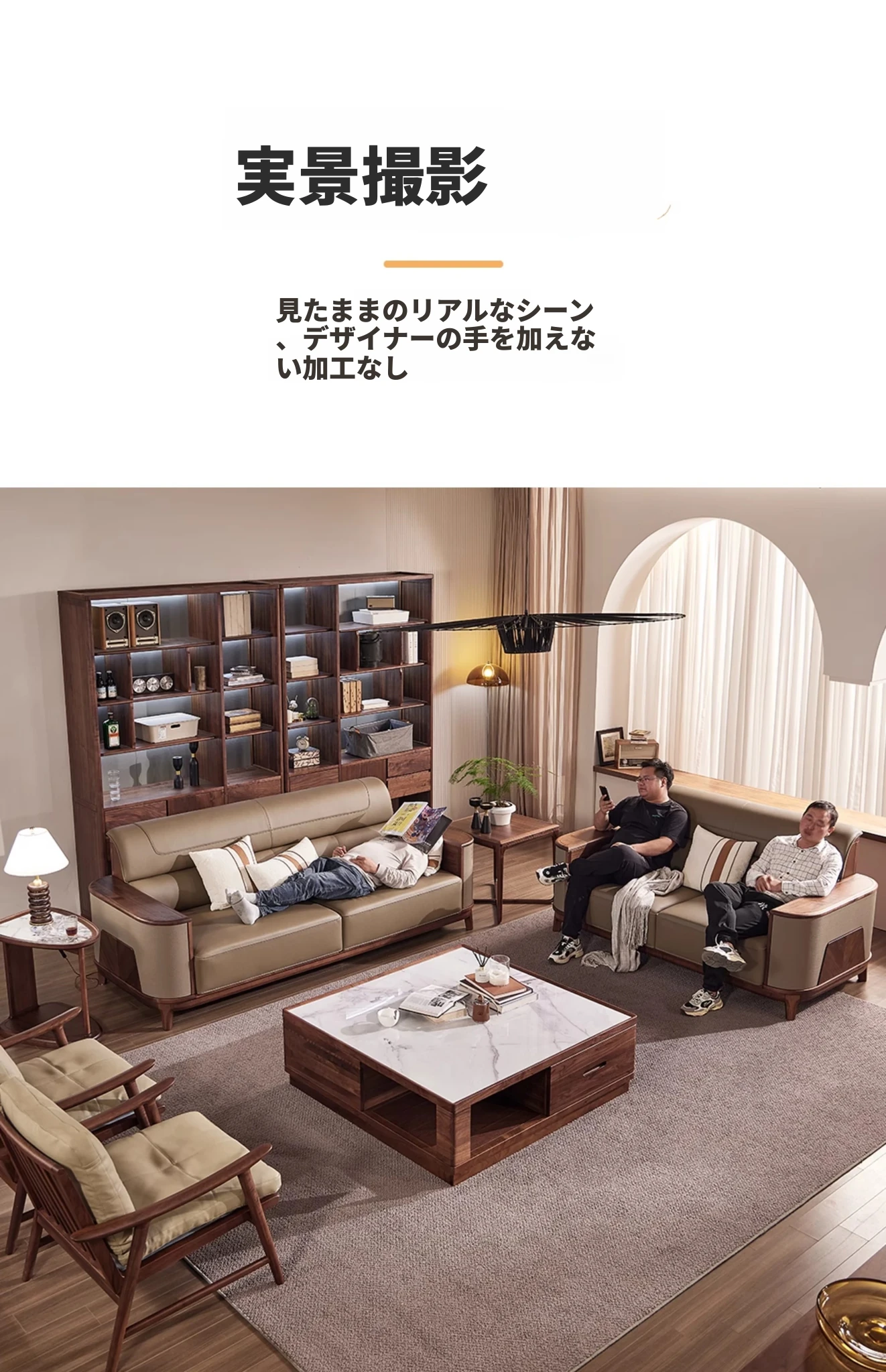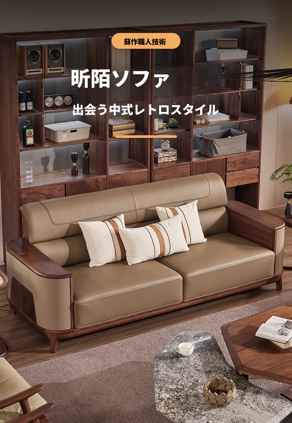 北米産ブラックウォールナットのソファ|モダン中式レトロヴィラリビング用|本物の木と真皮を使用した豪華なソファセット!快適さと高級感を兼ね備えた一品。