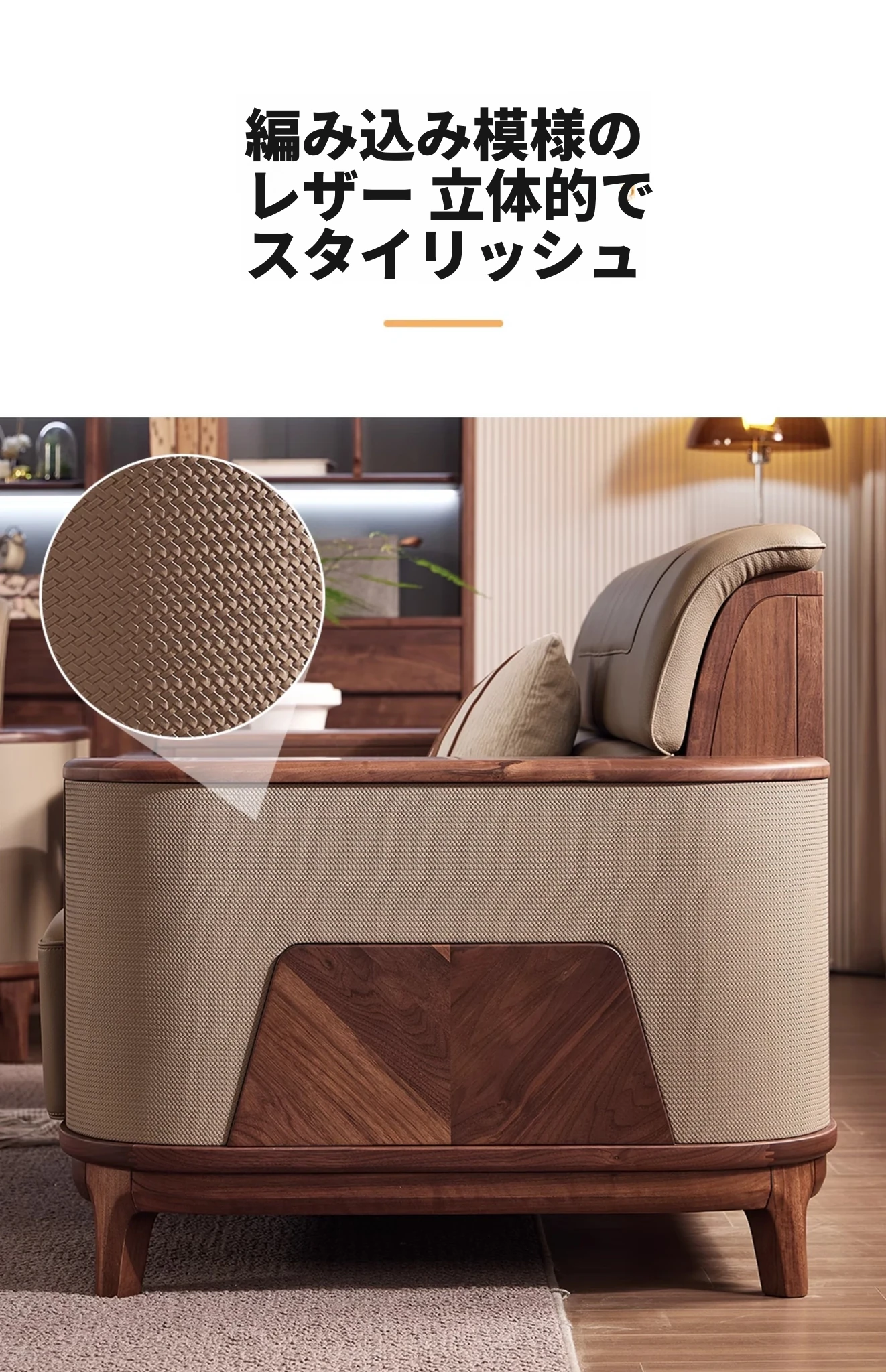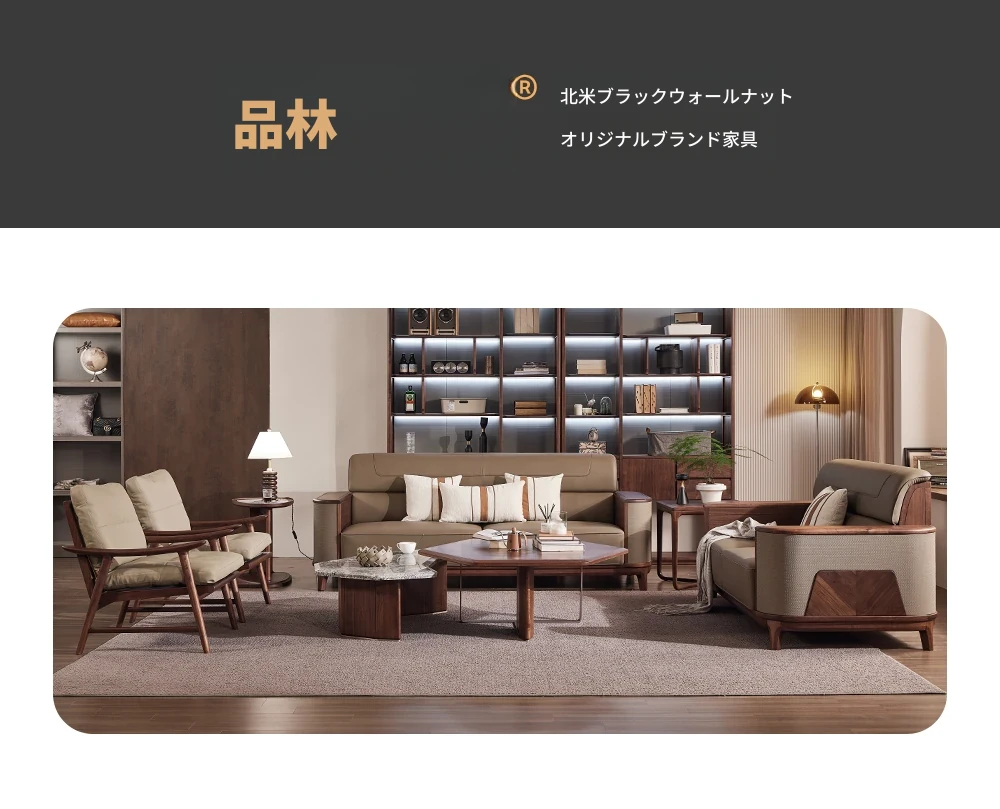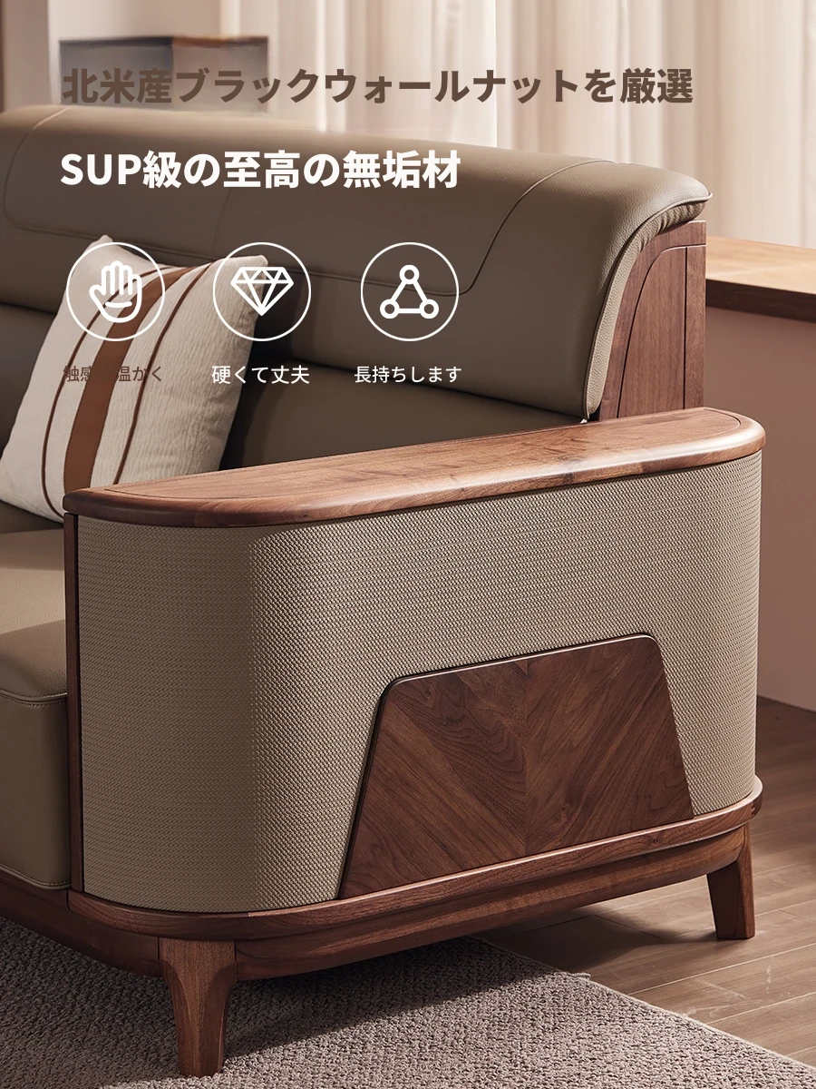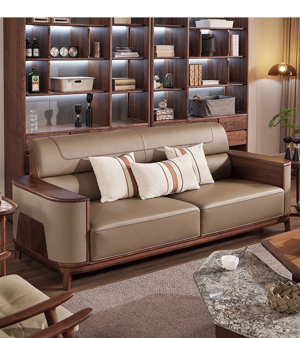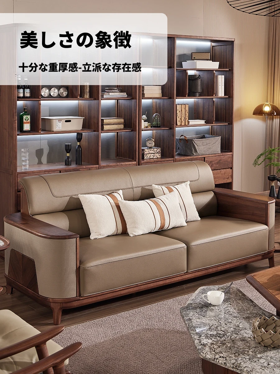 北米産ブラックウォールナットのソファ|モダン中式レトロヴィラリビング用|本物の木と真皮を使用した豪華なソファセット!快適さと高級感を兼ね備えた一品。