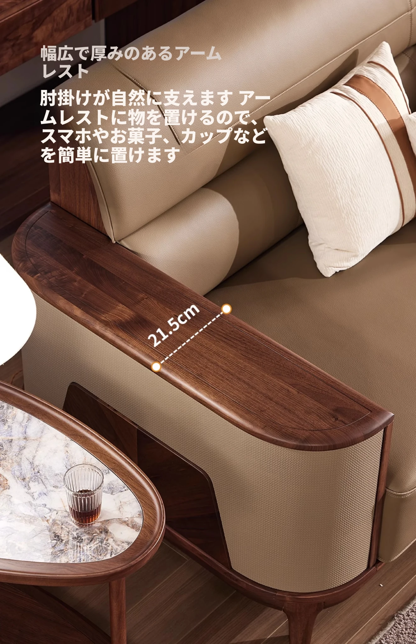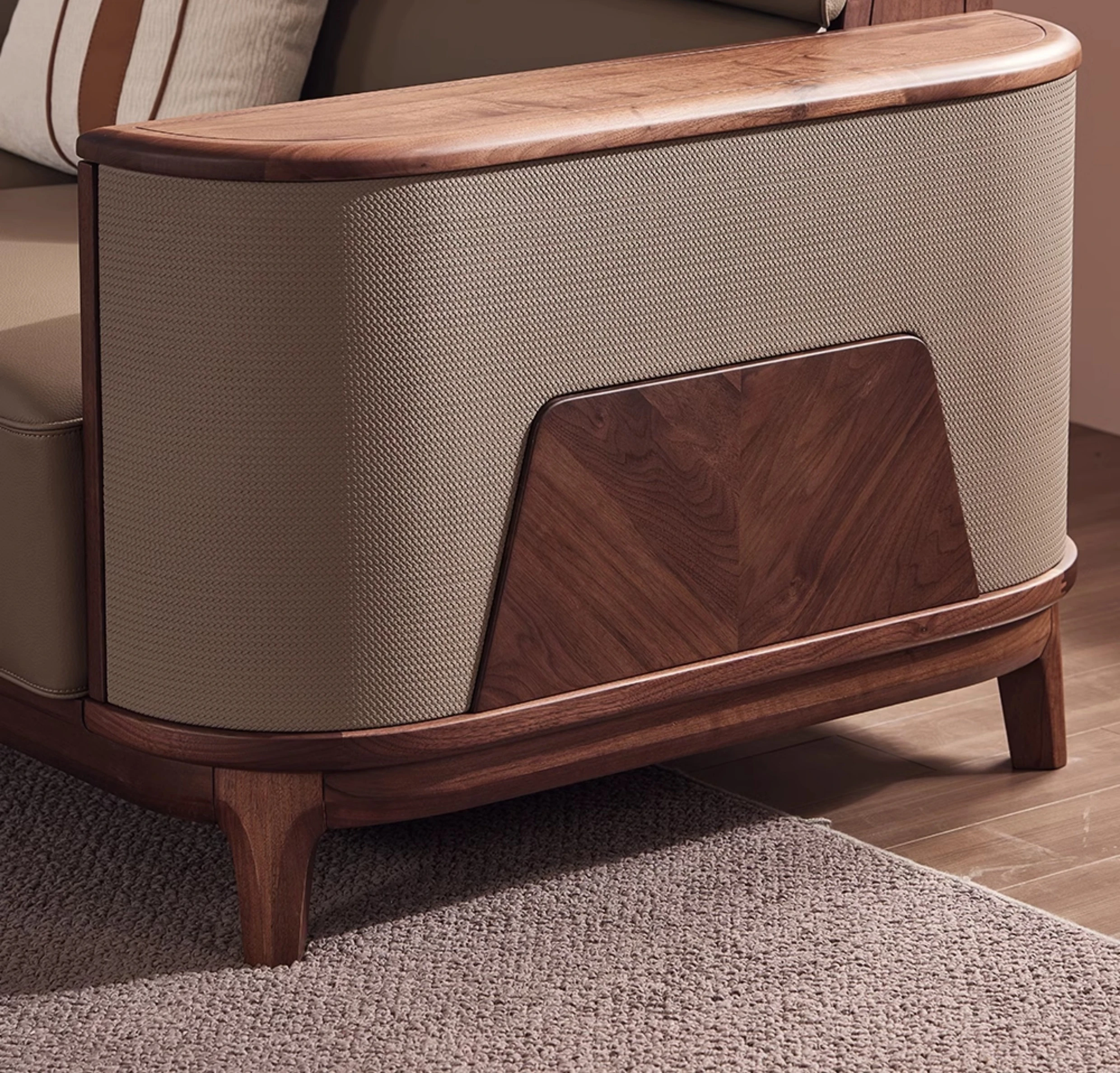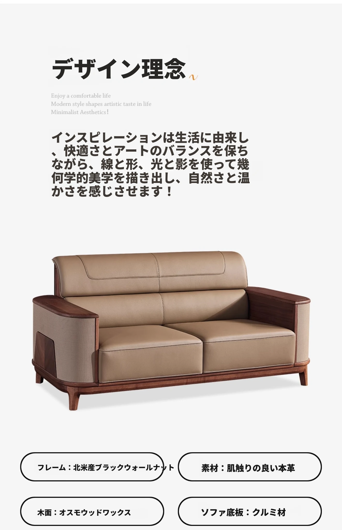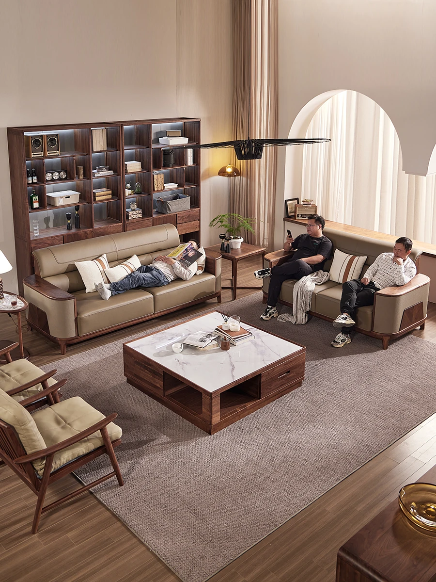 北米産ブラックウォールナットのソファ|モダン中式レトロヴィラリビング用|本物の木と真皮を使用した豪華なソファセット!快適さと高級感を兼ね備えた一品。