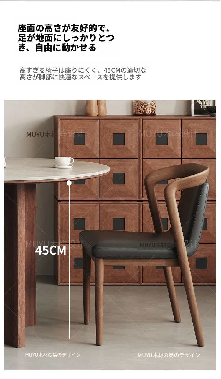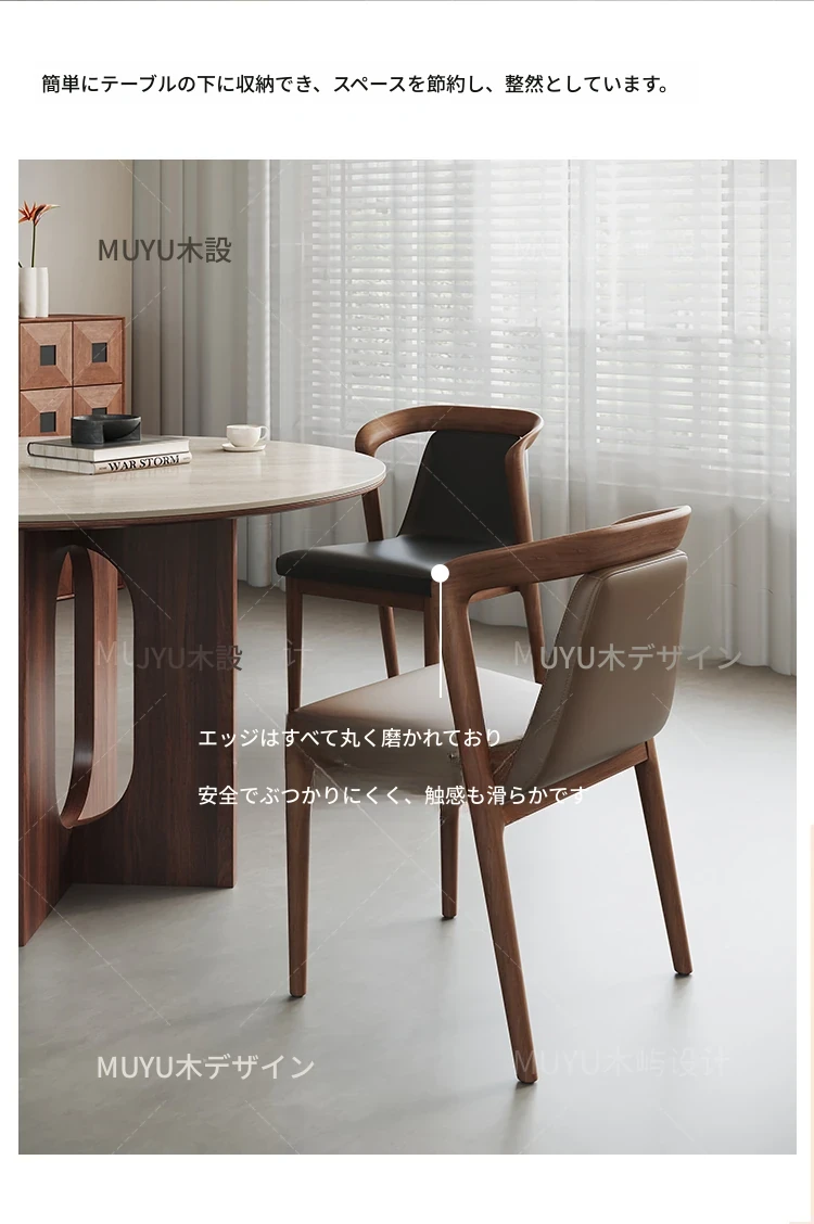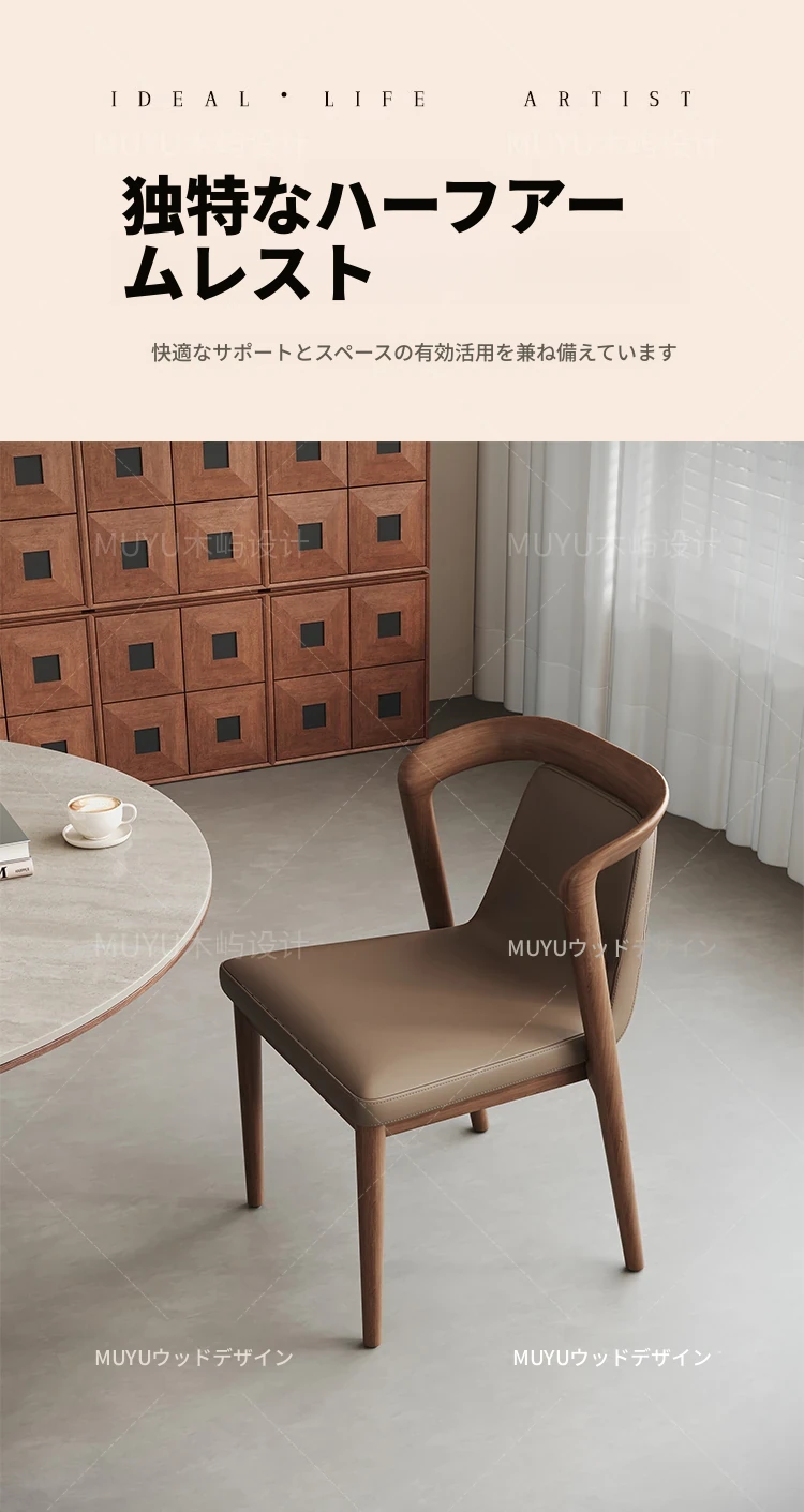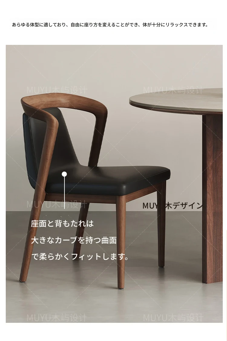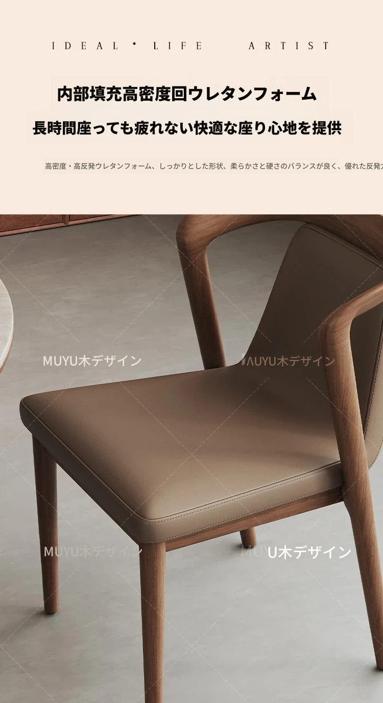 北欧スタイルの無垢材&レザー製ダイニングチェア - モダンでシンプルなデザイン、リラックスできる背もたれとアームレスト付き、イタリアンテイストの書斎やダイニングルームに最適なソフトパッケージチェア!