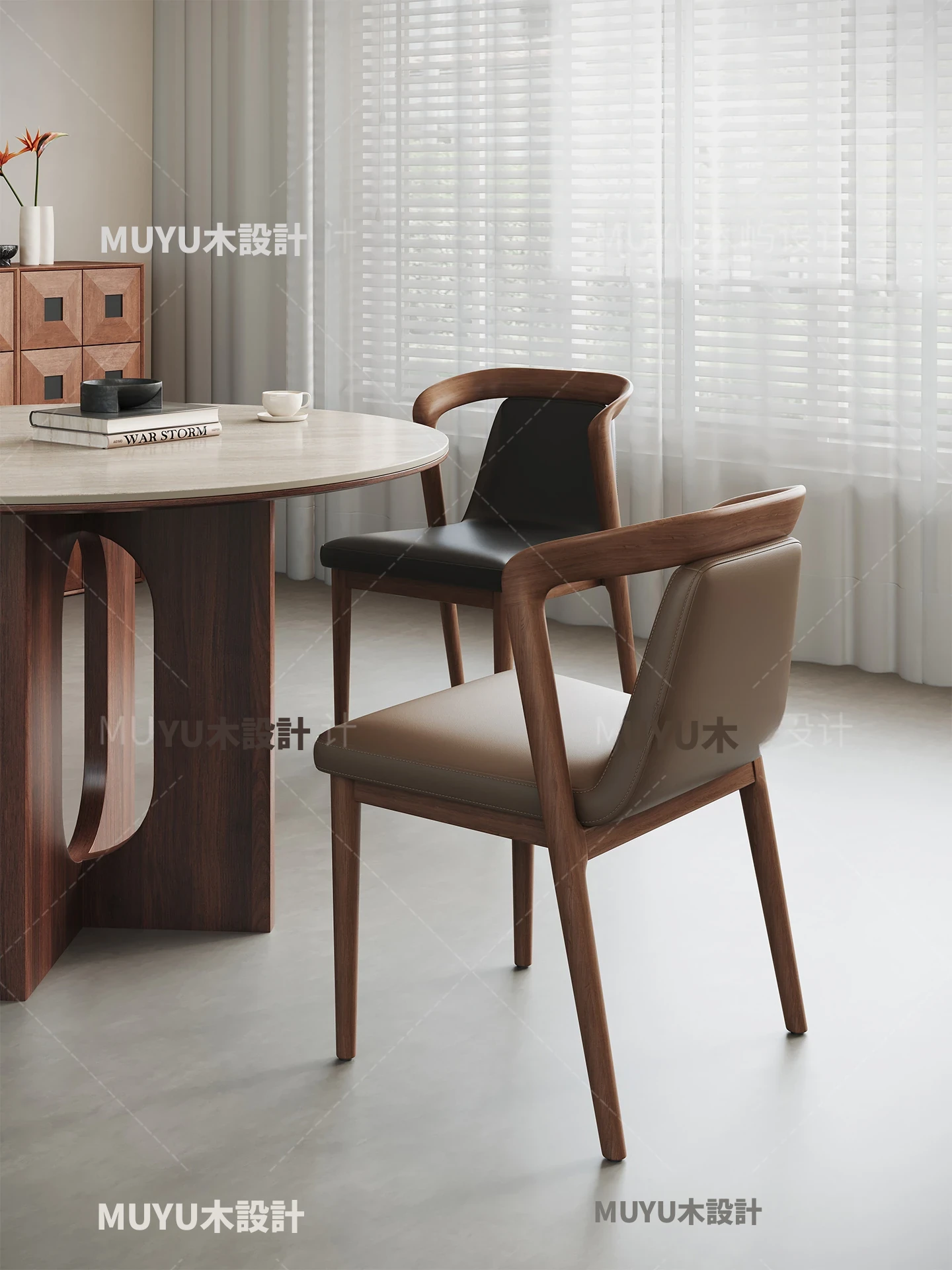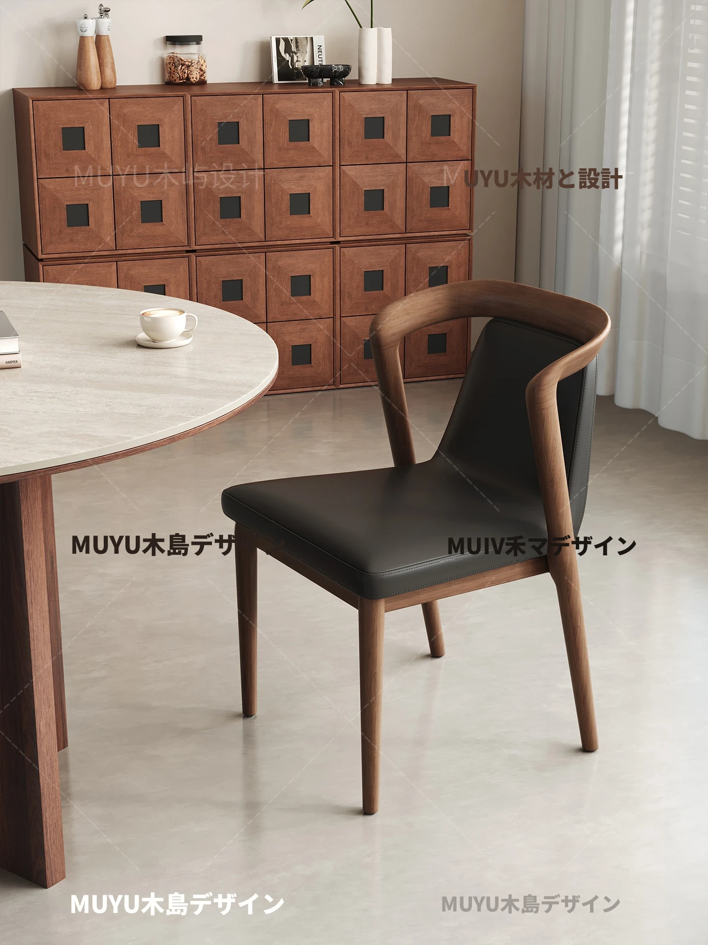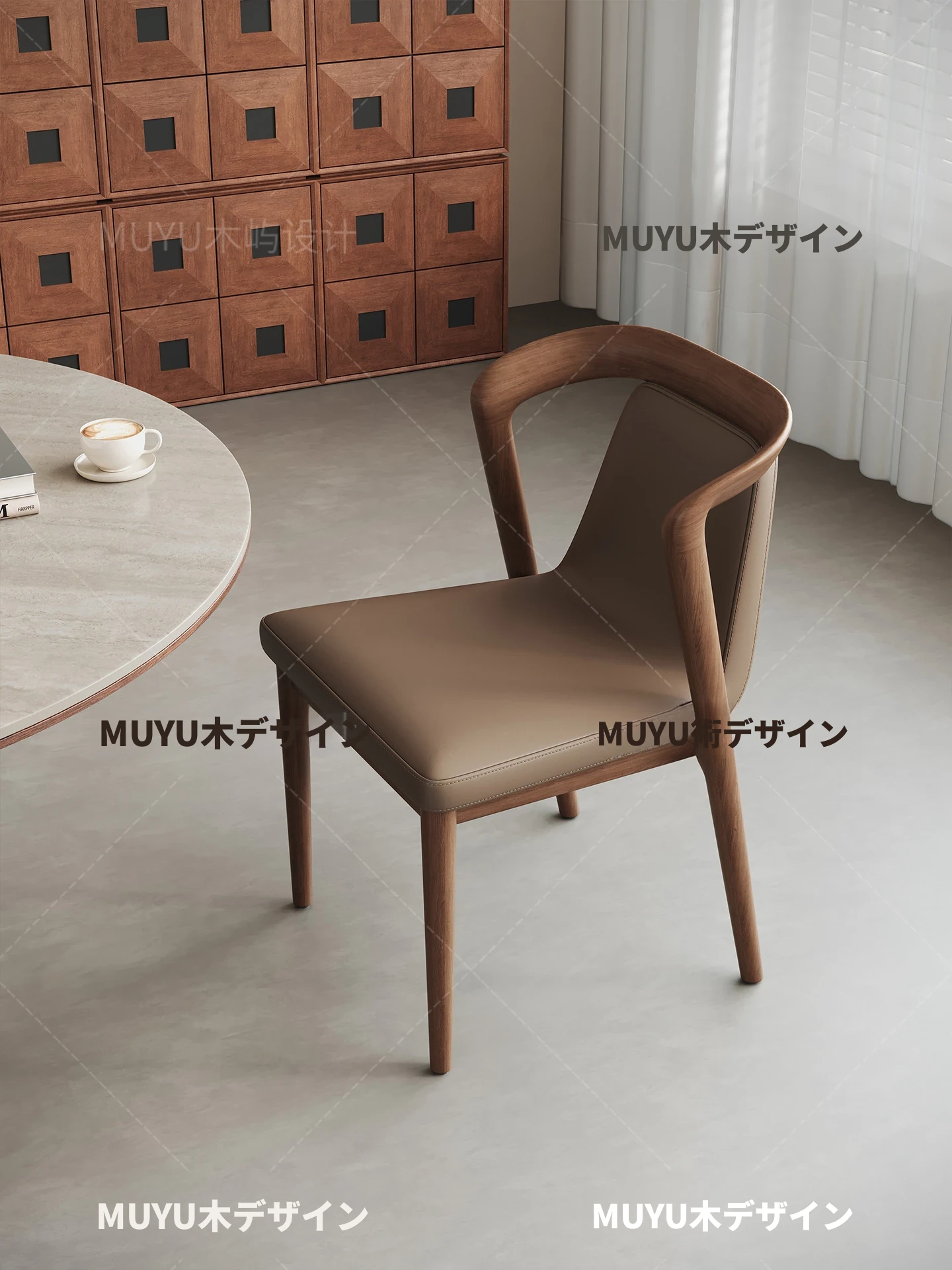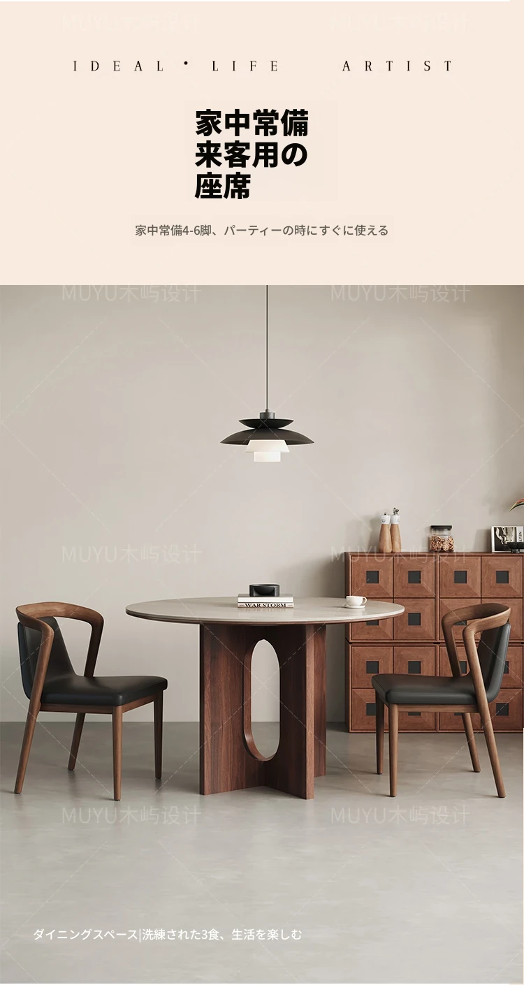 北欧スタイルの無垢材&レザー製ダイニングチェア - モダンでシンプルなデザイン、リラックスできる背もたれとアームレスト付き、イタリアンテイストの書斎やダイニングルームに最適なソフトパッケージチェア!