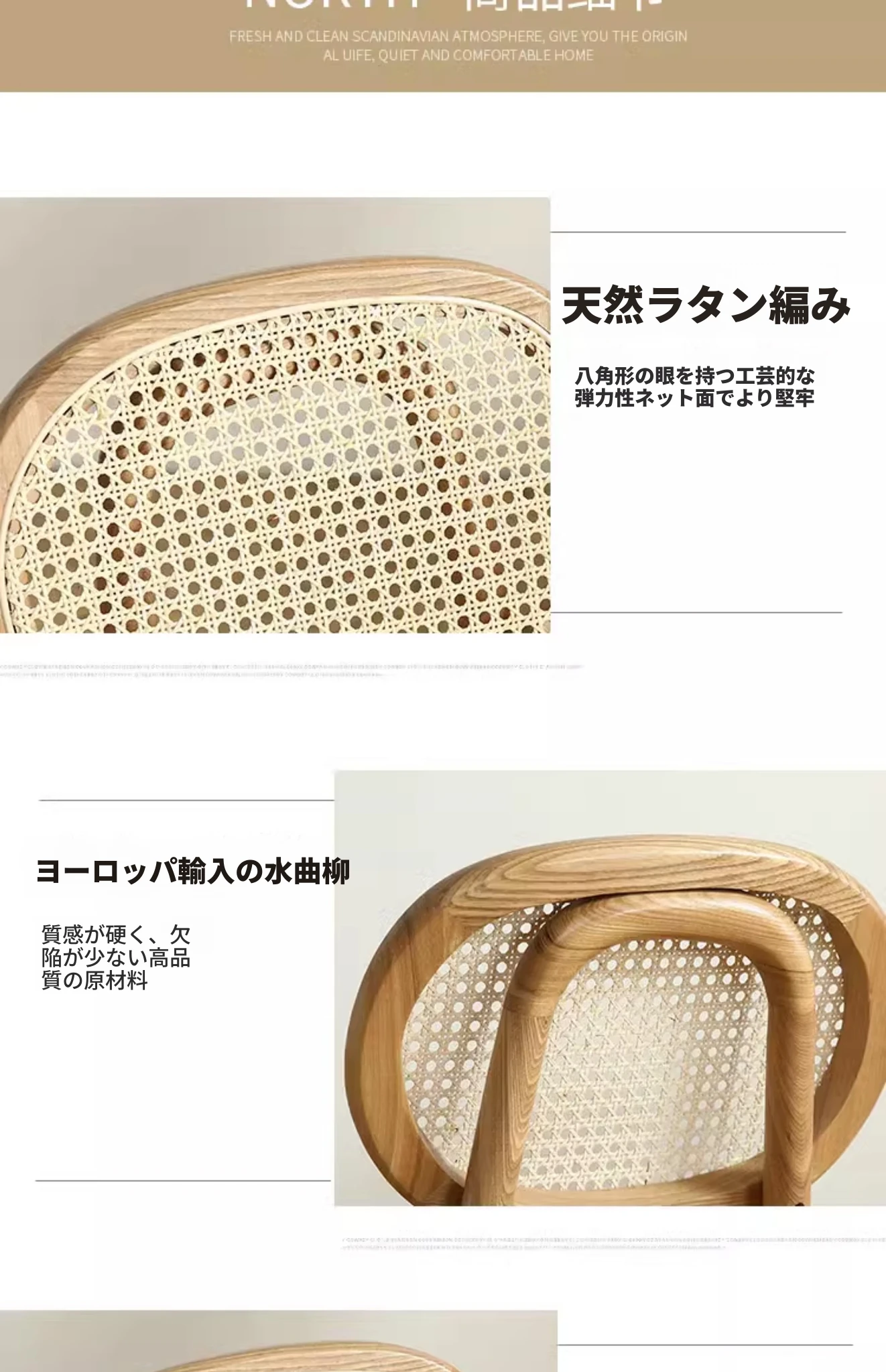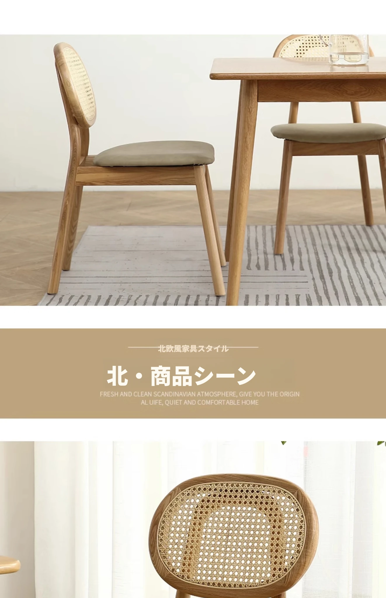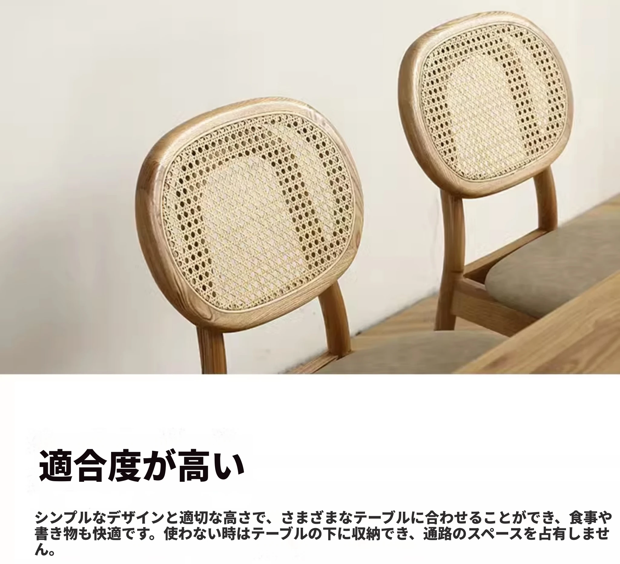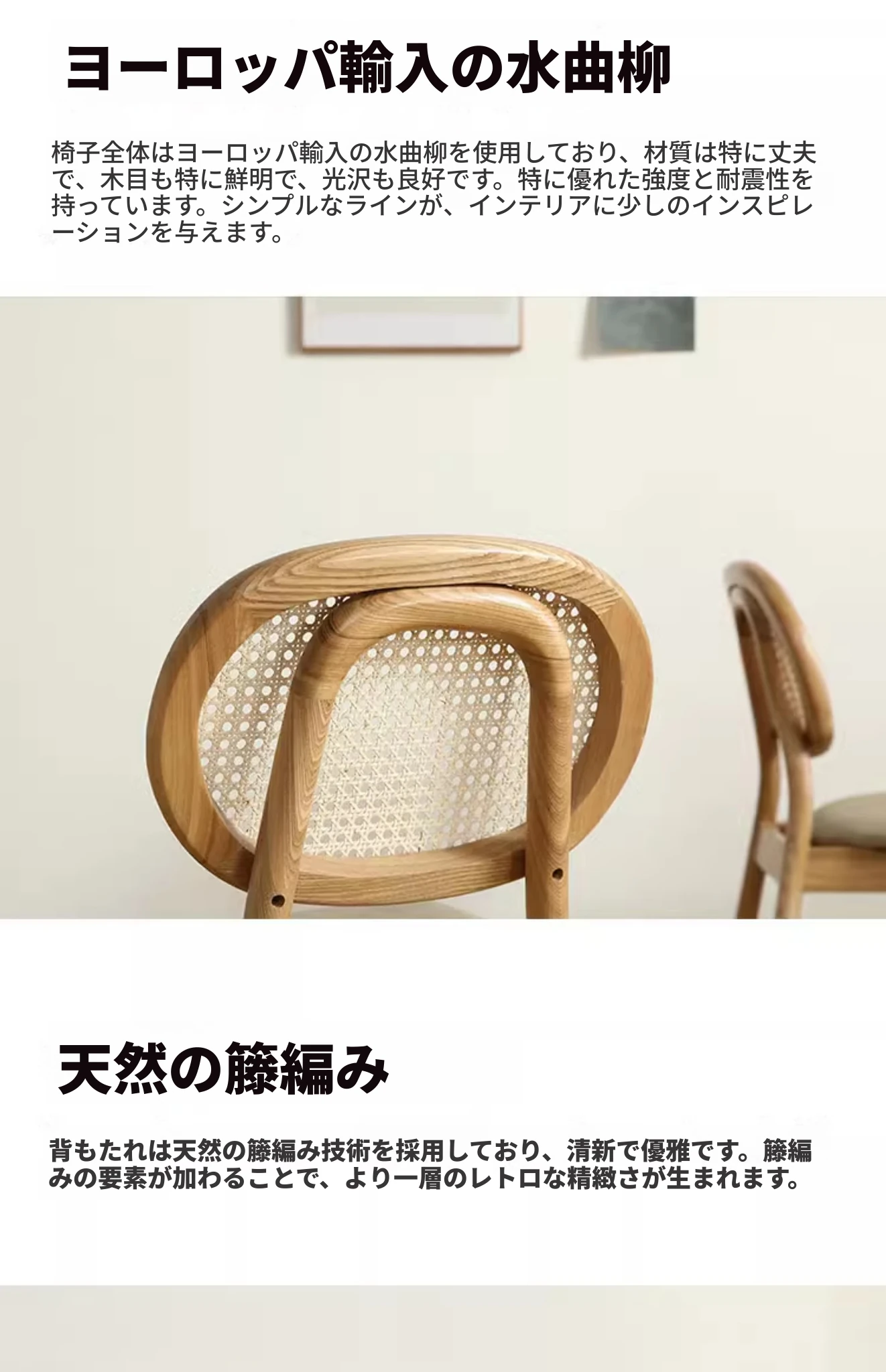 北欧風の無垢材とラタン編みのダイニングチェア - サステナブルでシンプルな侘寂スタイル、快適なクッション付き、デザイナーチェア。小さなスペースにもぴったりの高品質リラックスチェア。