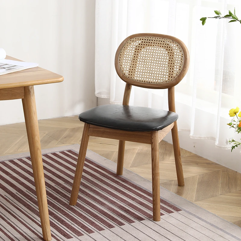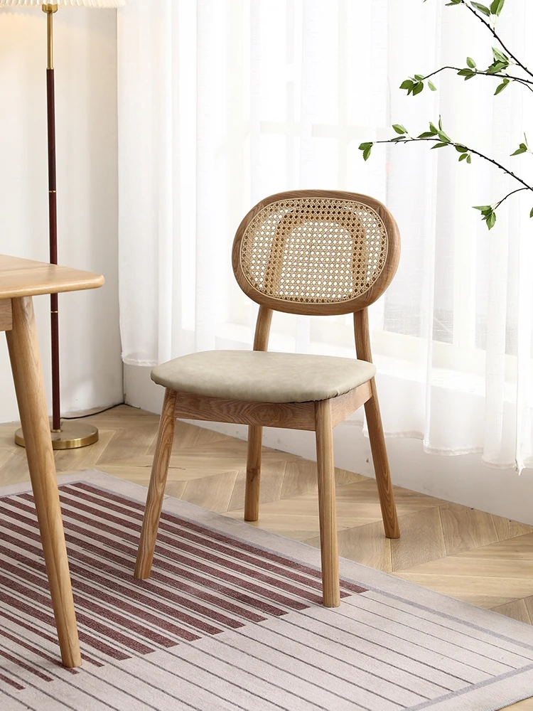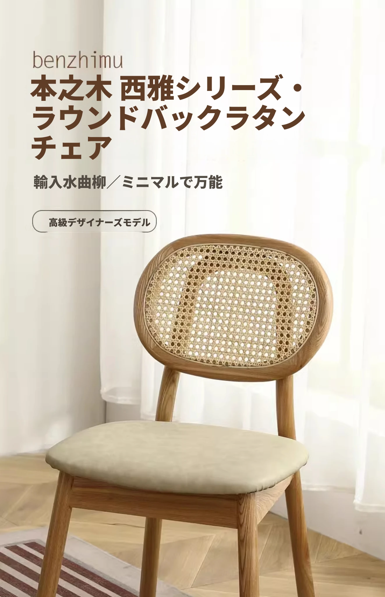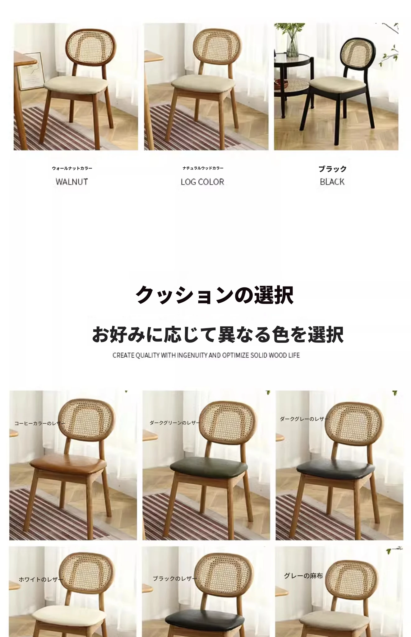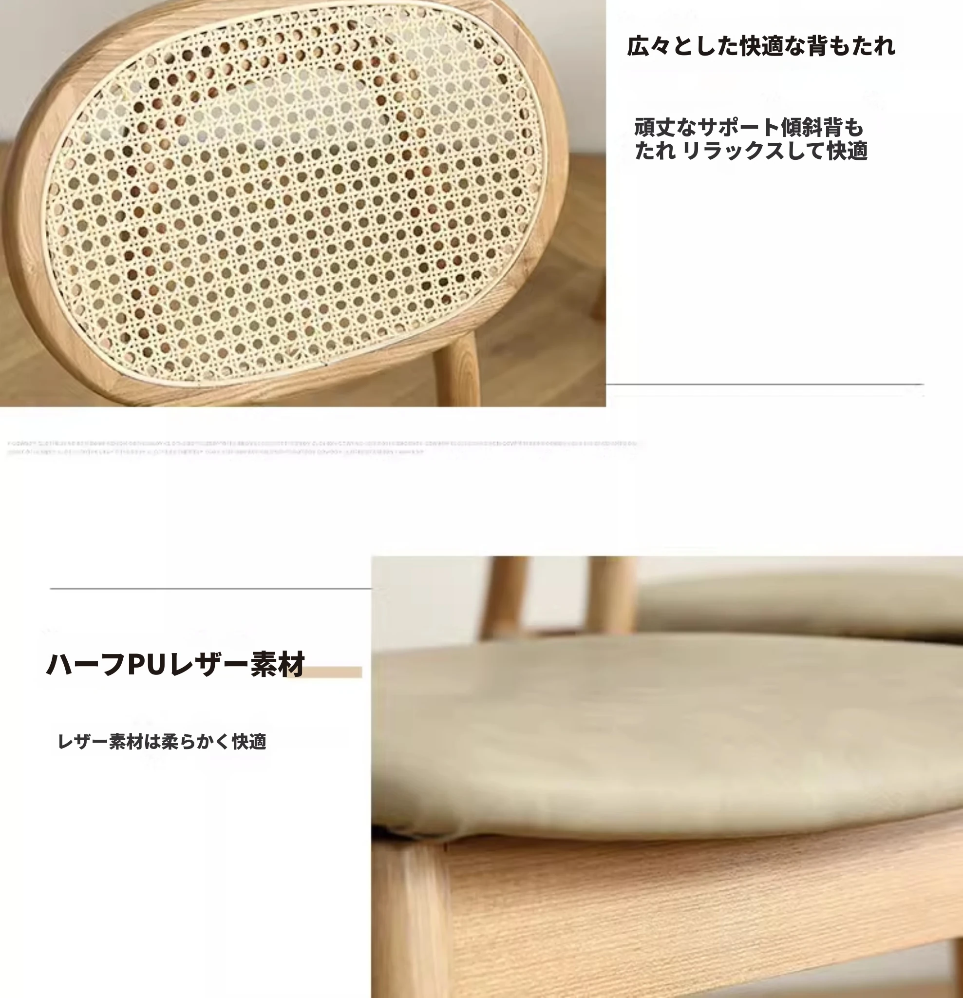 北欧風の無垢材とラタン編みのダイニングチェア - サステナブルでシンプルな侘寂スタイル、快適なクッション付き、デザイナーチェア。小さなスペースにもぴったりの高品質リラックスチェア。