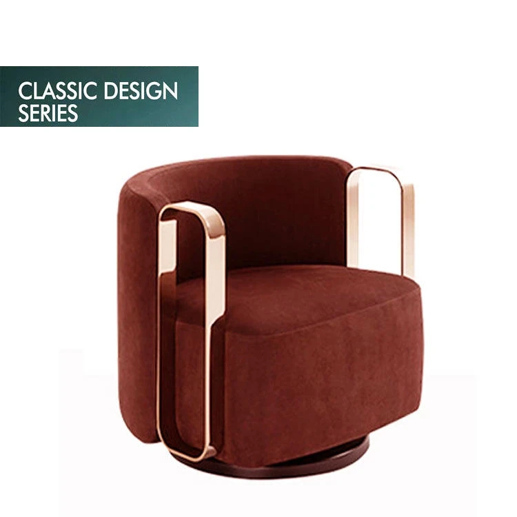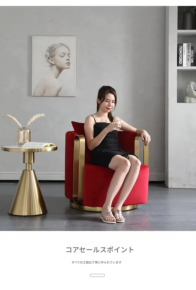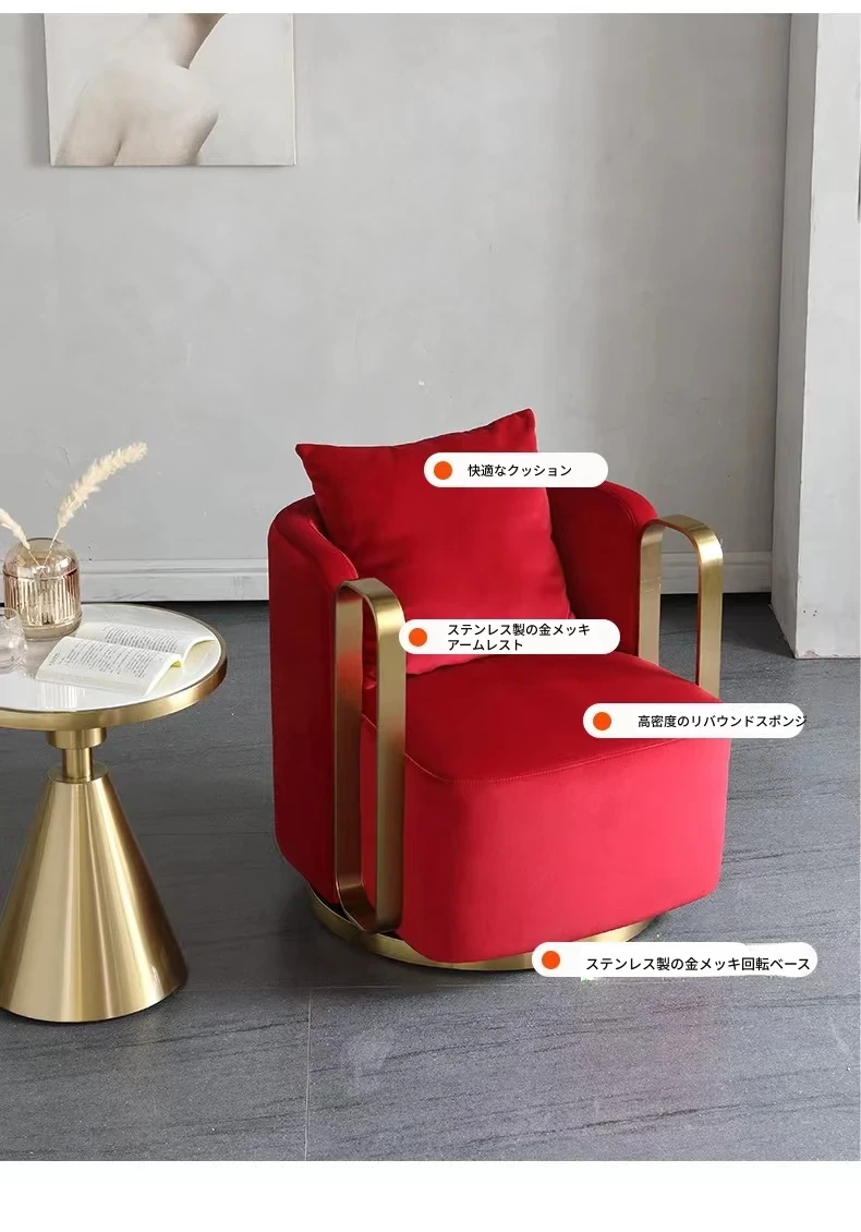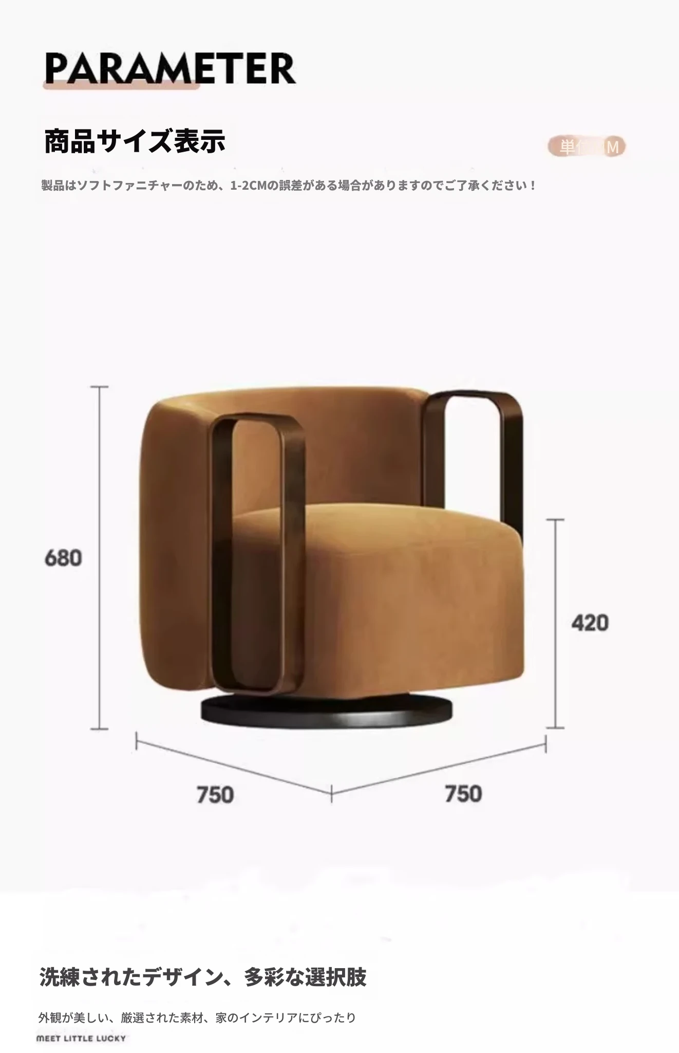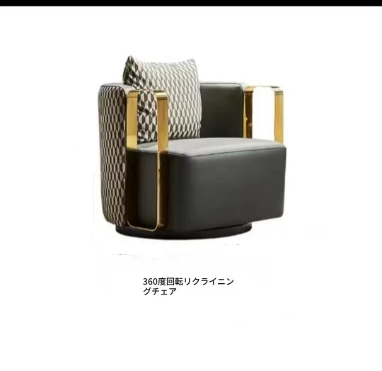 チタン金、軽奢感溢れる回転式一人掛けソファ。モダンでシンプルなイタリアンデザイン、布張りとレザーの組み合わせで、くつろぎの時間を演出する洽談椅子。おしゃれで快適なリビングの必需品です!