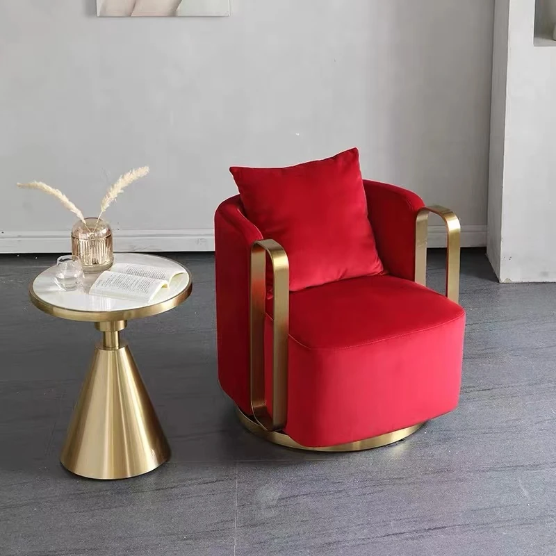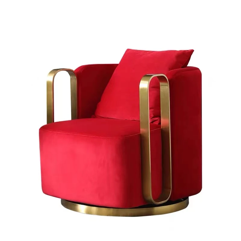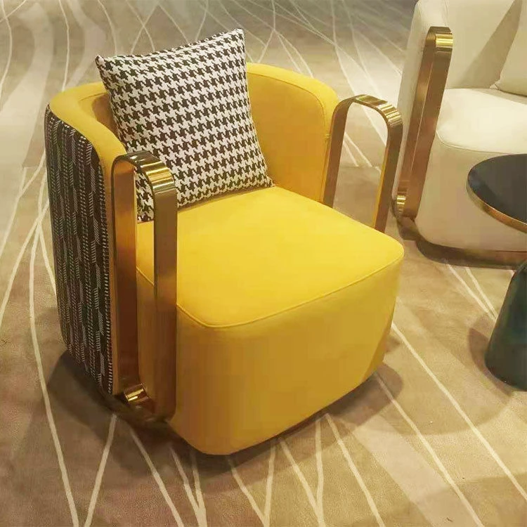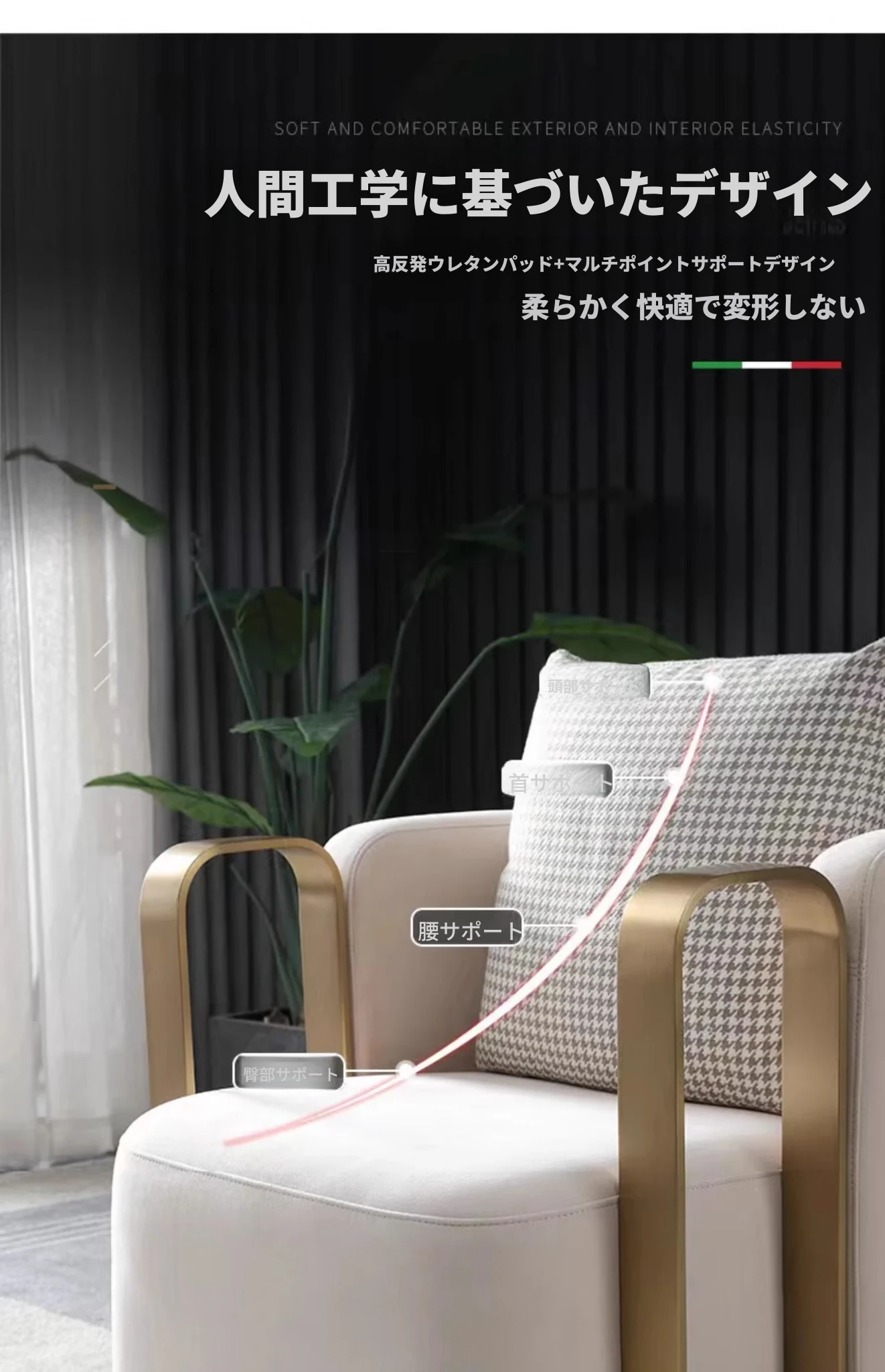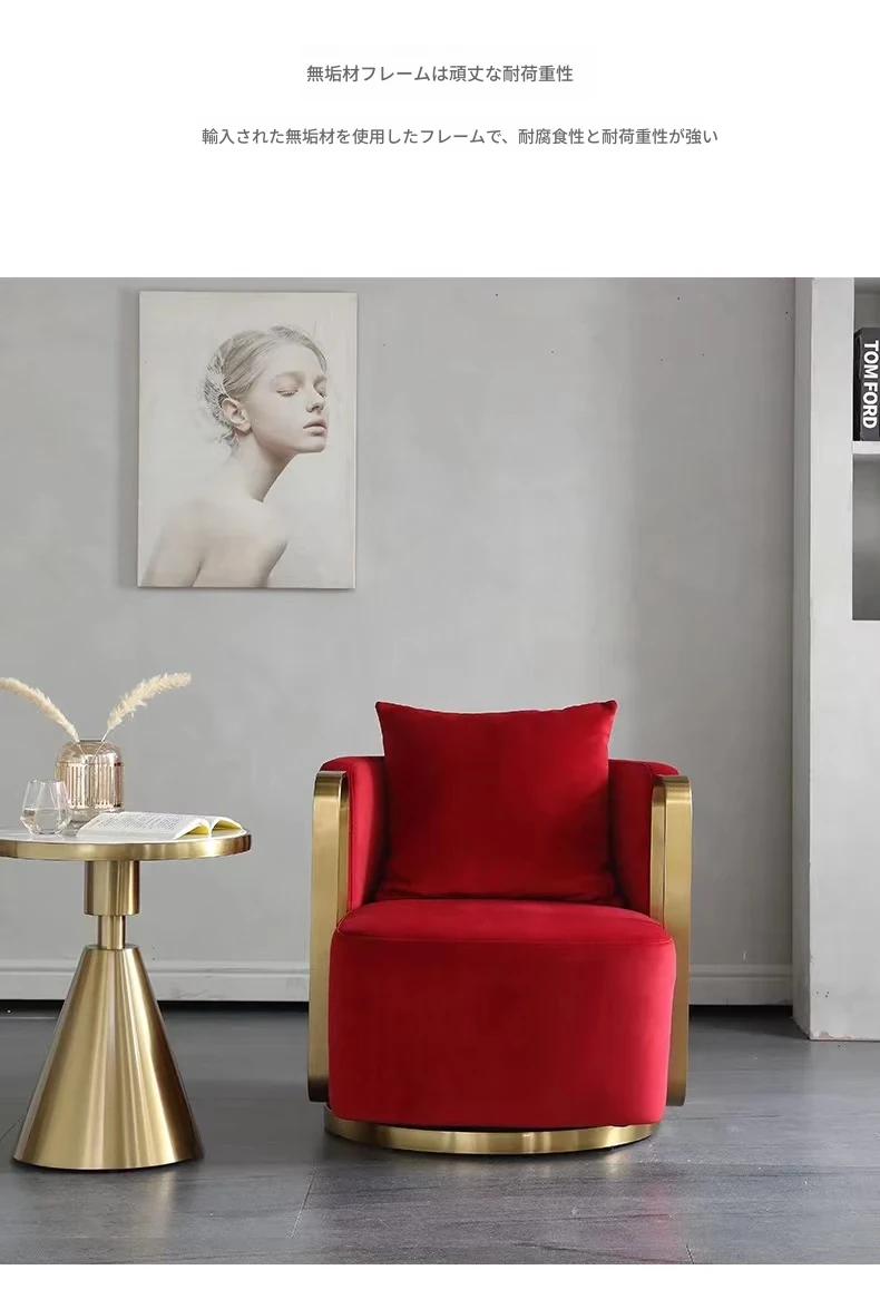 チタン金、軽奢感溢れる回転式一人掛けソファ。モダンでシンプルなイタリアンデザイン、布張りとレザーの組み合わせで、くつろぎの時間を演出する洽談椅子。おしゃれで快適なリビングの必需品です!