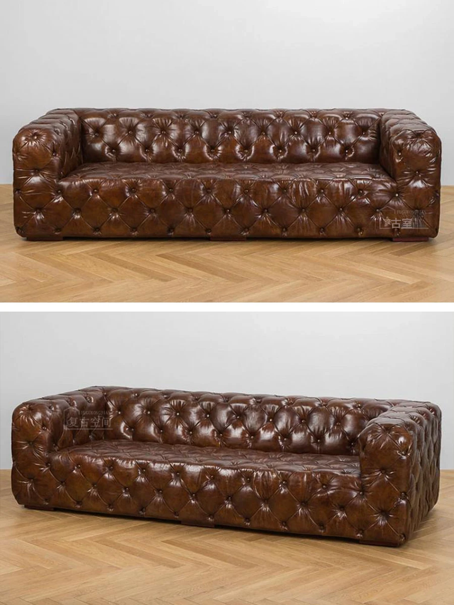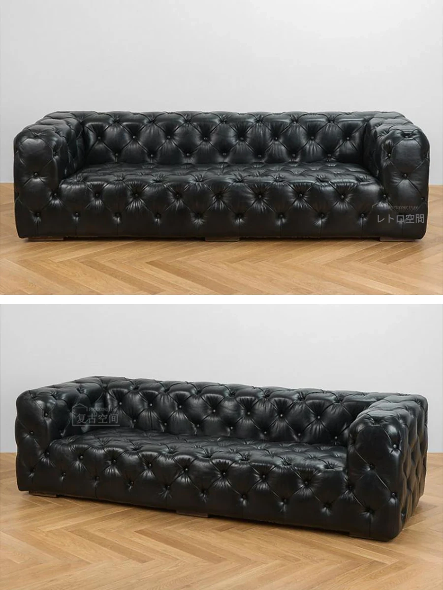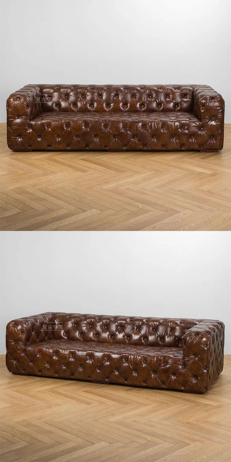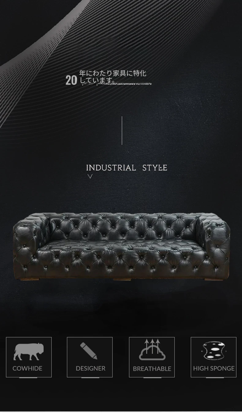 レトロインダストリアルスタイルのアメリカン本革ソファ - 高級オイルワックス牛革使用、快適な3人掛けソファ。別荘やシガーバーに最適な洗練されたデザインで、リラックスした空間を演出します。