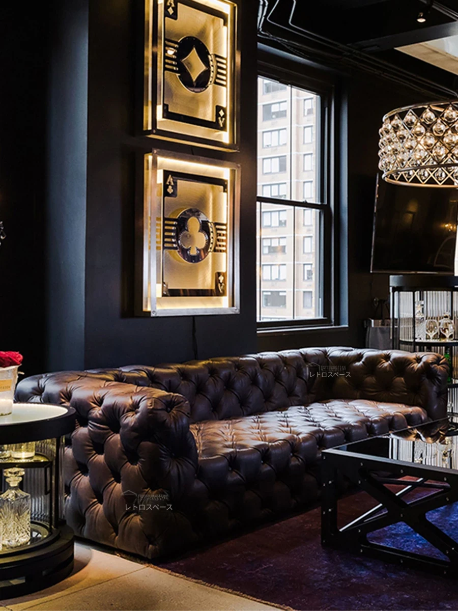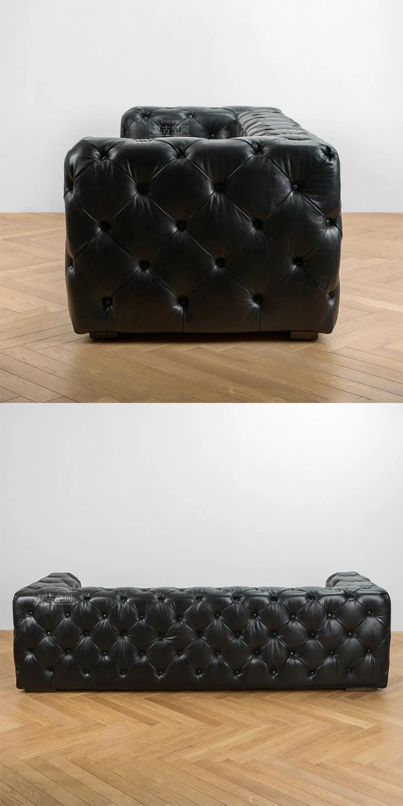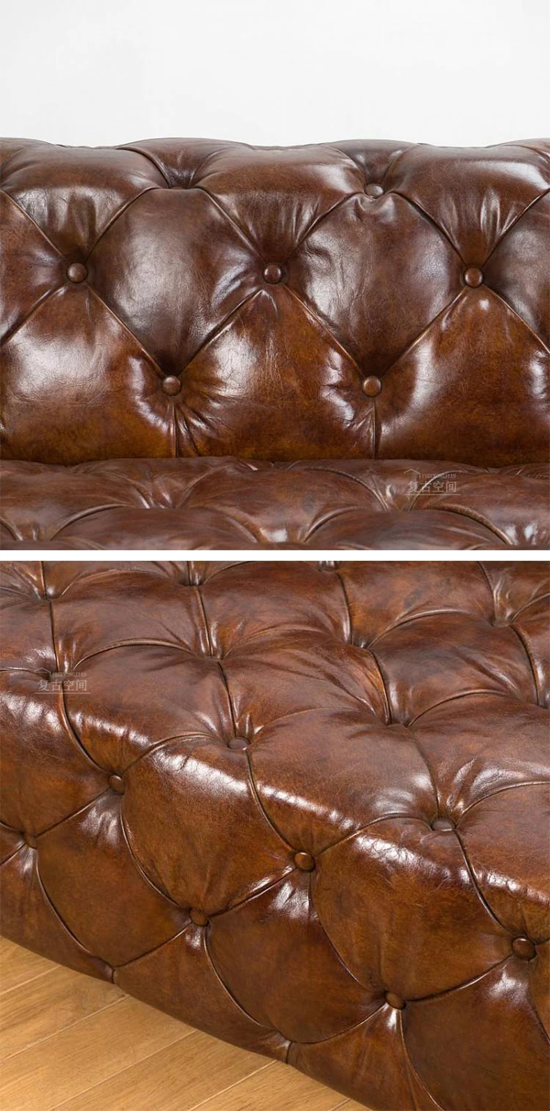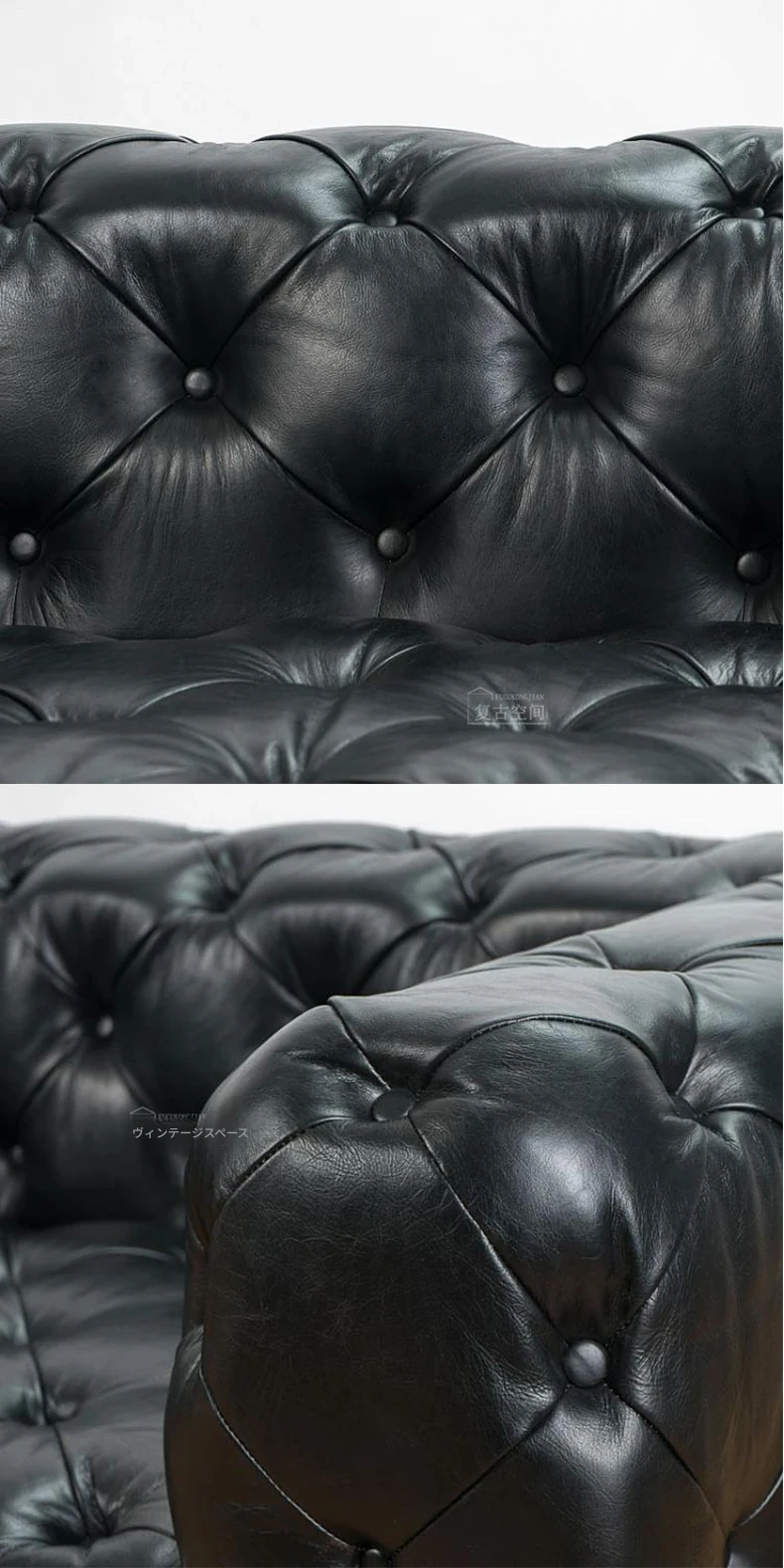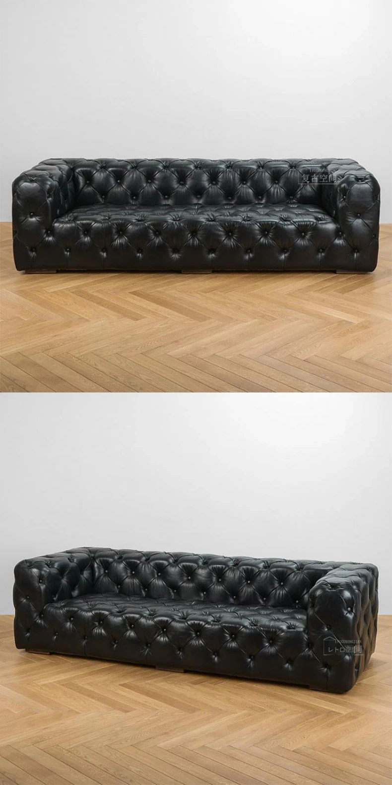 レトロインダストリアルスタイルのアメリカン本革ソファ - 高級オイルワックス牛革使用、快適な3人掛けソファ。別荘やシガーバーに最適な洗練されたデザインで、リラックスした空間を演出します。