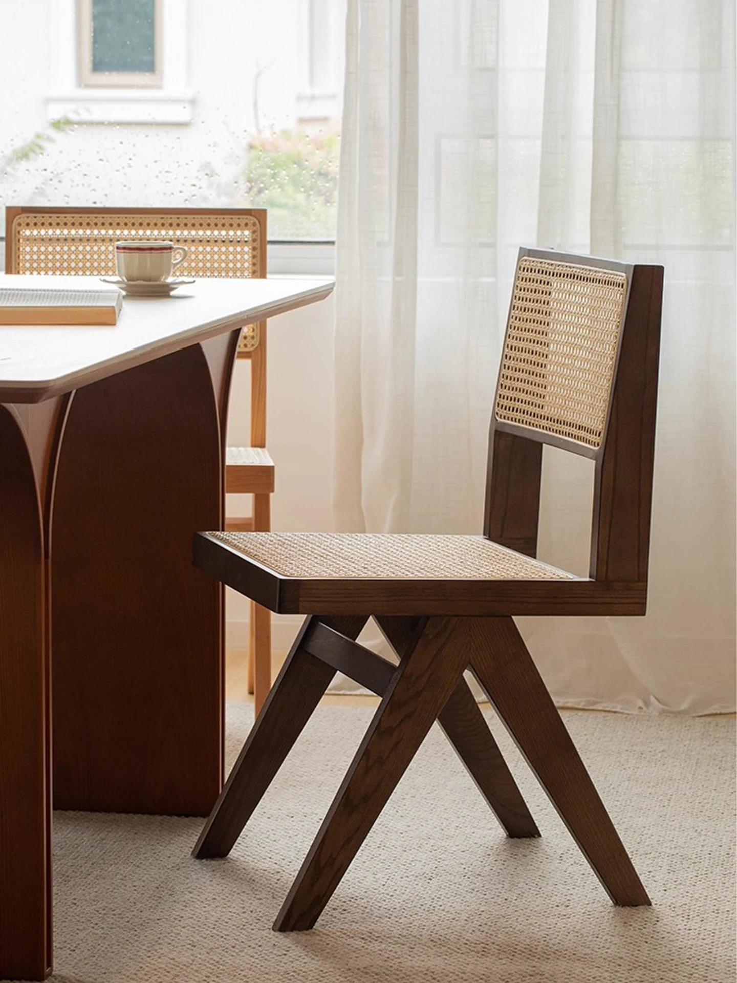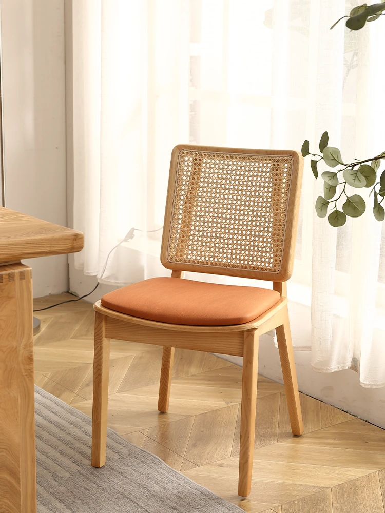 無垢材ホワイトアッシュのダイニングチェア - インドネシア製ラタン編みバックレスト付き!侘寂風のミニマルデザインで、書斎や民宿、カフェにぴったり。おしゃれで心地よい空間を演出します。