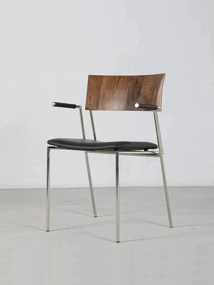 イタリアンミニマリズムの本革ダイニングチェア|ナチュラルウォールナット無垢材|シンプルでエレガントなデザイン|ステンレス製アームレスト付き|ヴィンテージデザイナーの魅力を引き立てる一品!